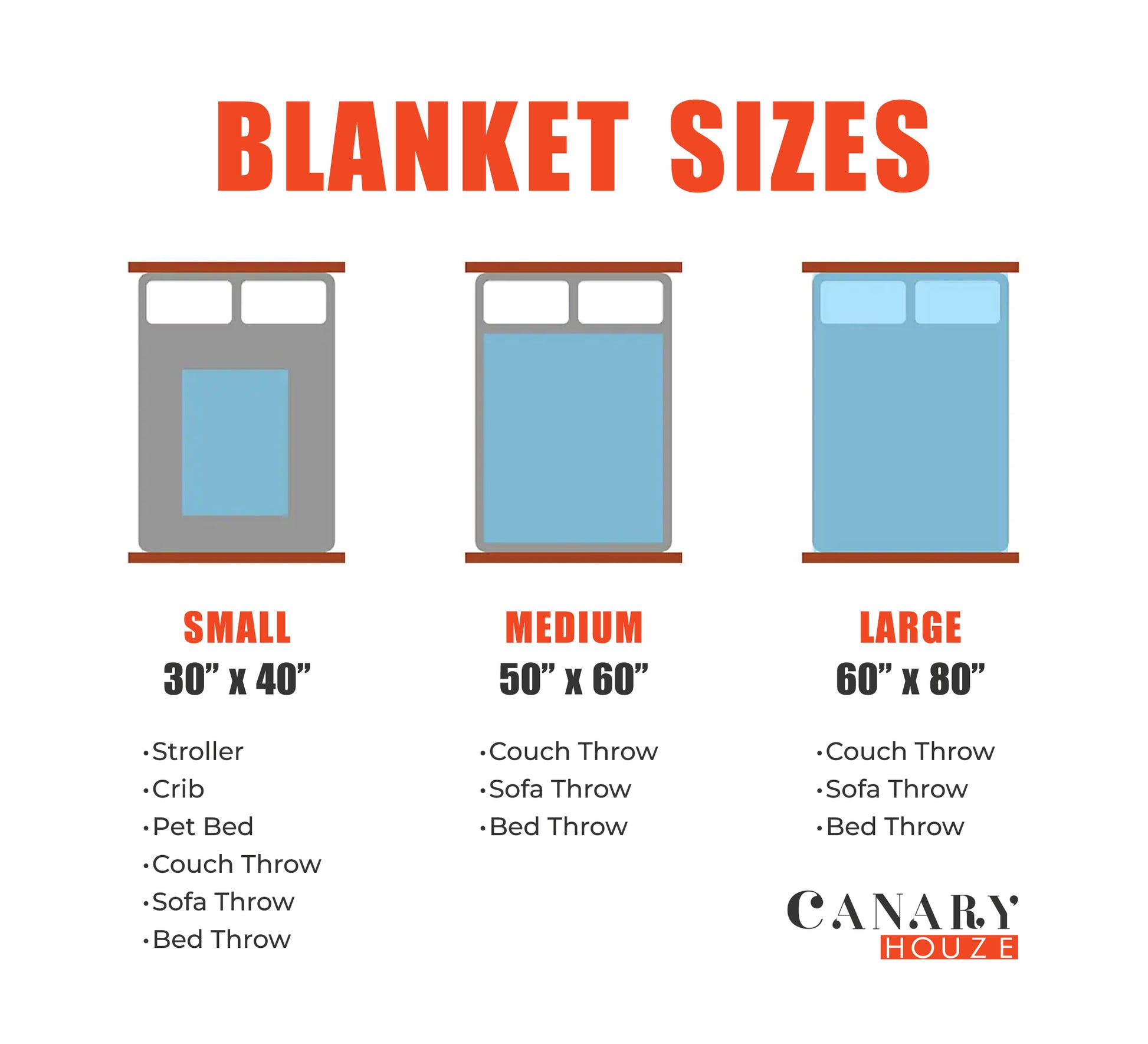 - Mink Blanket: 30x40, 50x60, and 60x80 inches.