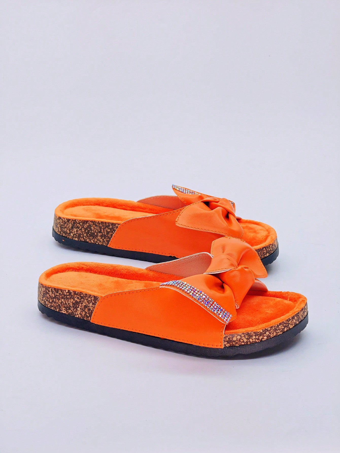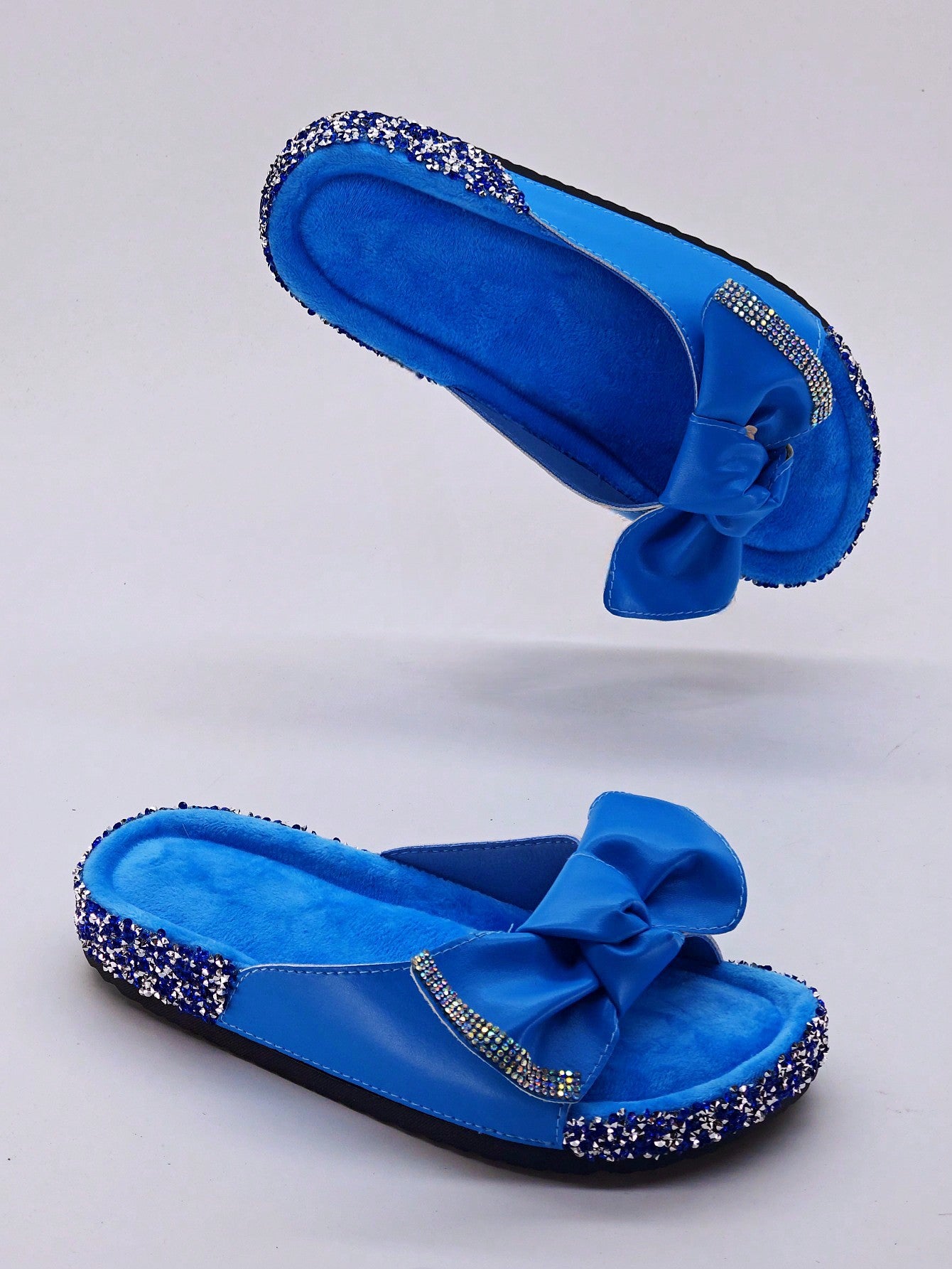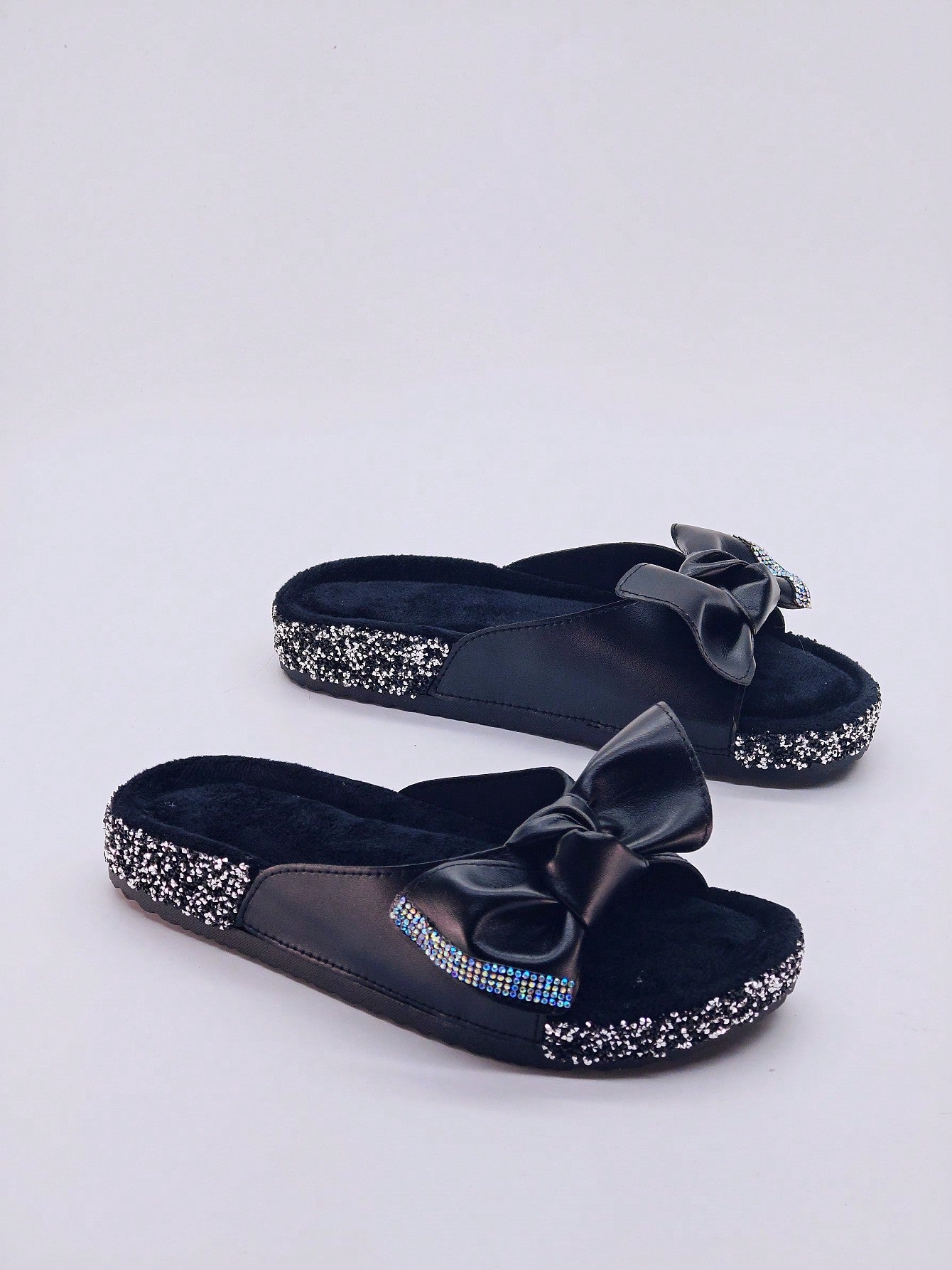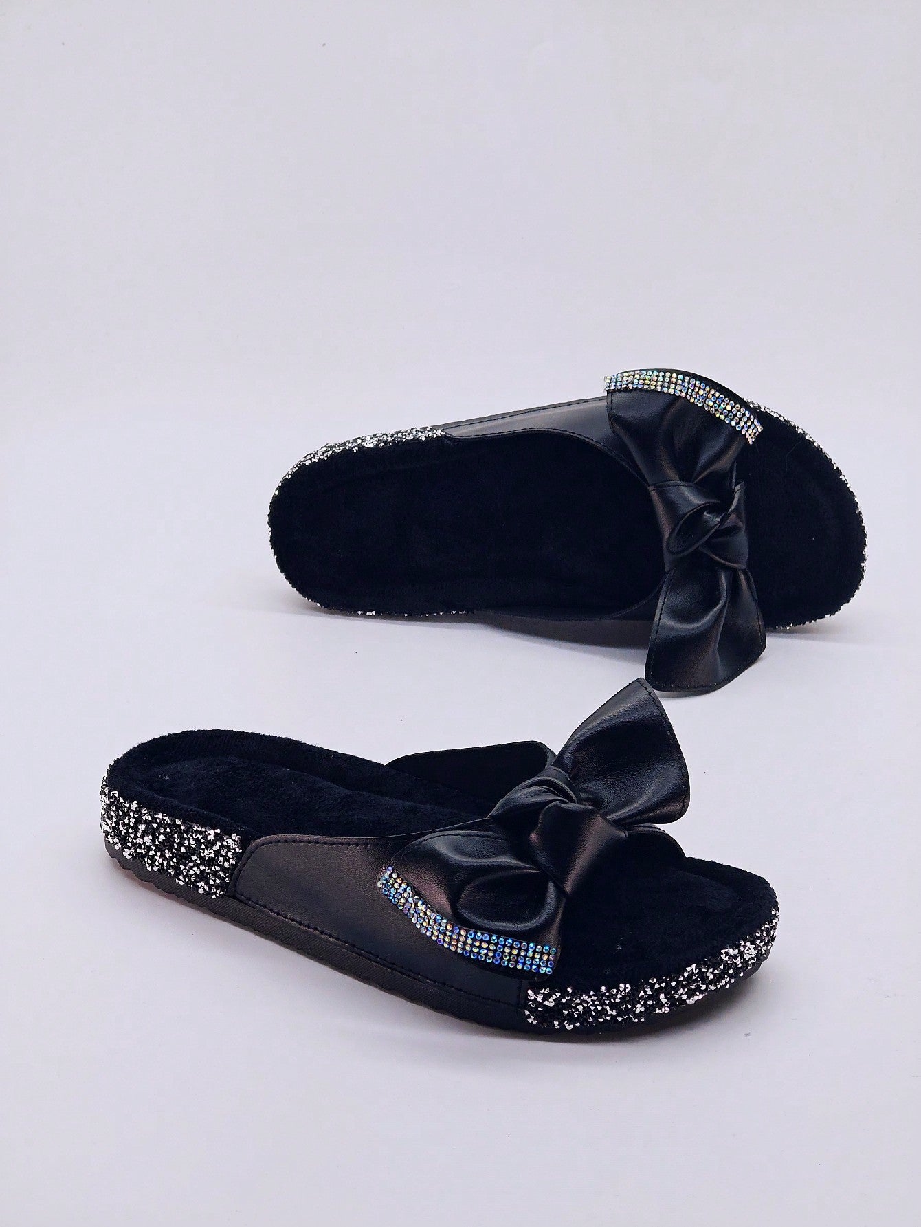 Black Bow Knot Diamond Studded Slide Sandals: Trendy Flats for Beach Vacation