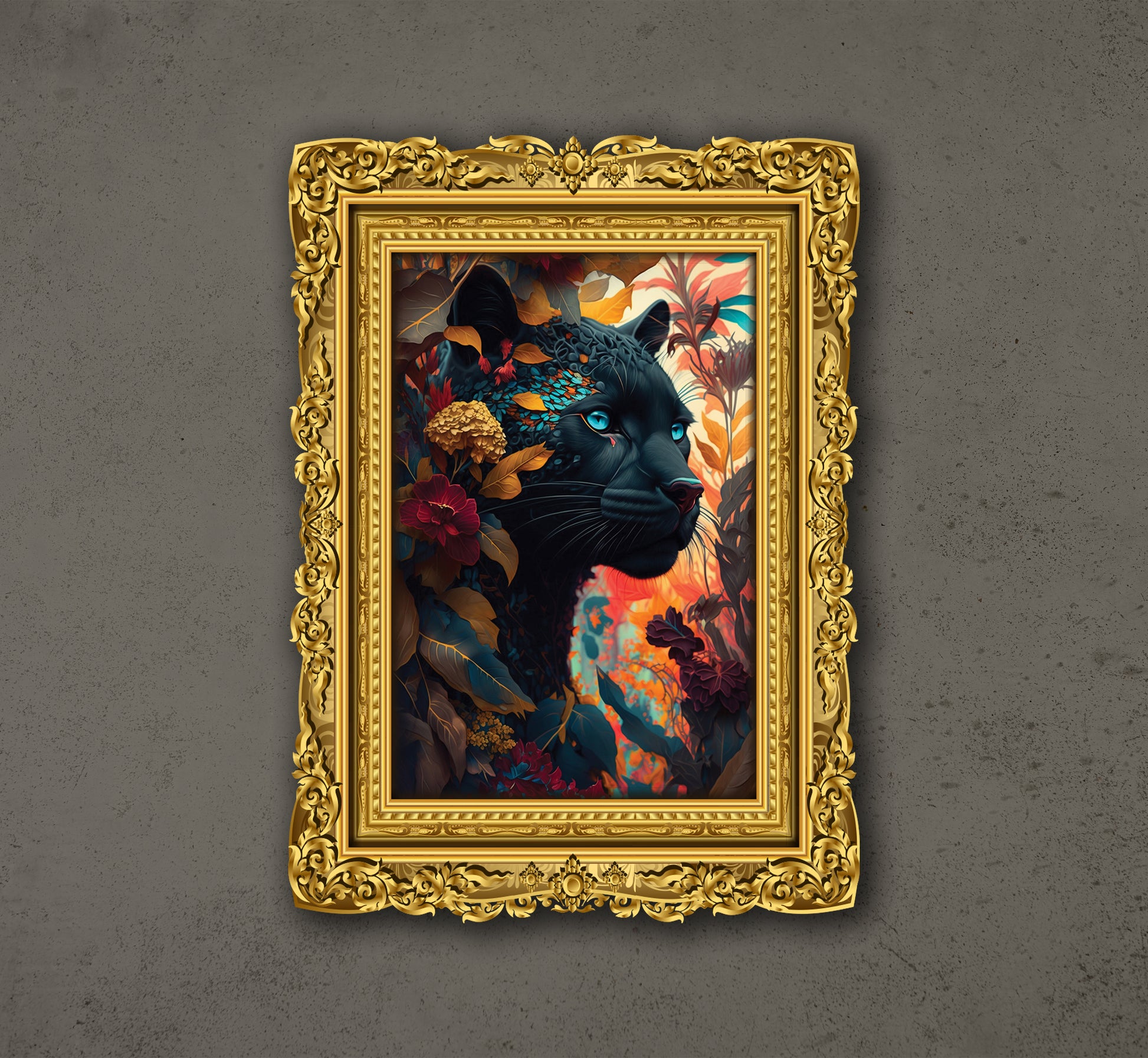 This printable art features a majestic black panther hiding behind intricate and vibrant flowers. Its poster design is perfect for any wall or room, creating a unique and stylish statement.