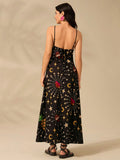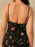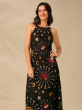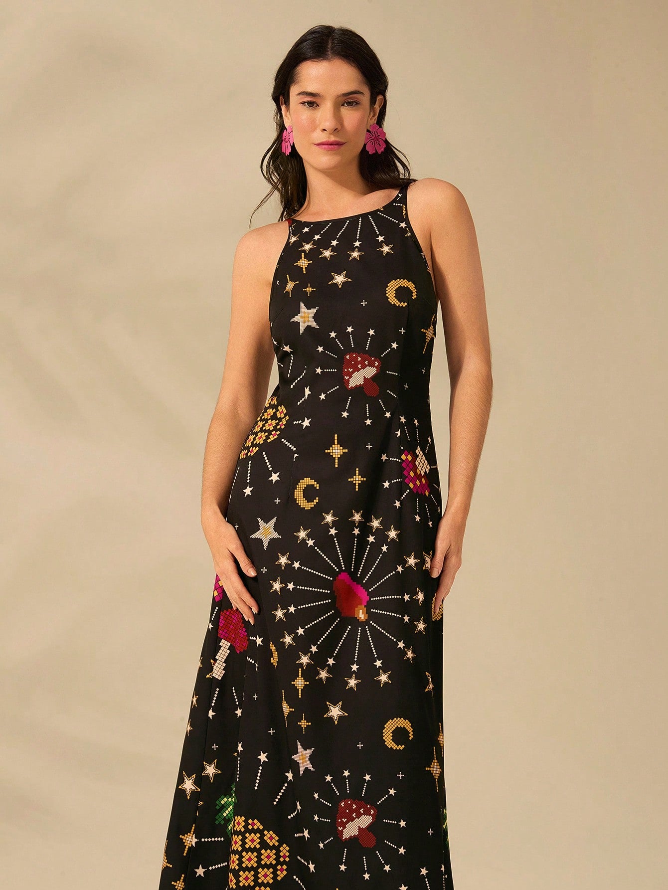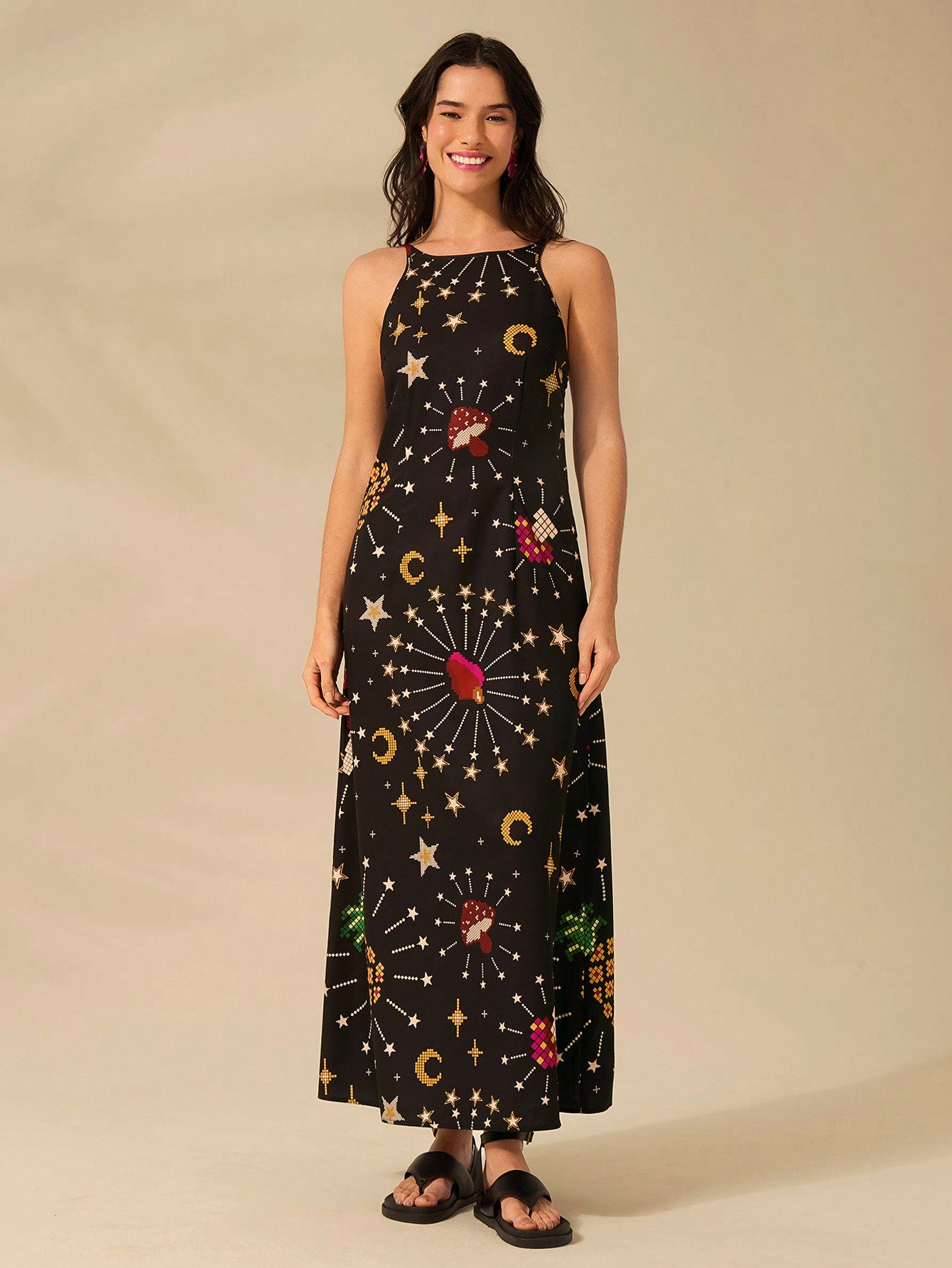 Boho Bliss: Women's Star, Moon & Mushroom Print Sleeveless Black Long Dress for Summer Getaways