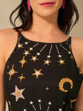 Unleash your inner bohemian with our Boho Bliss dress. Featuring a trendy black long design adorned with star, moon, and mushroom prints, this sleeveless dress is perfect for summer getaways. Embrace the carefree spirit and style of the boho lifestyle in this must-have piece.