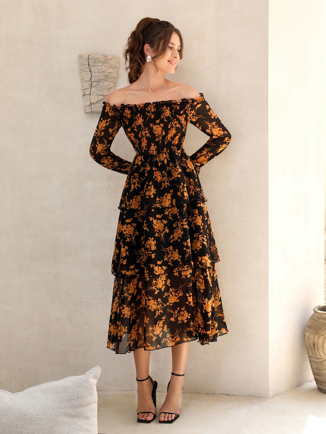 Unleash your inner bohemian with this stunning floral off-shoulder maxi dress. The flounce sleeves add a touch of whimsy to the chic design. Perfect for any occasion, this dress will have you feeling effortlessly stylish and confident. (No boring floral arrangements here, just a chic and flirty look!)