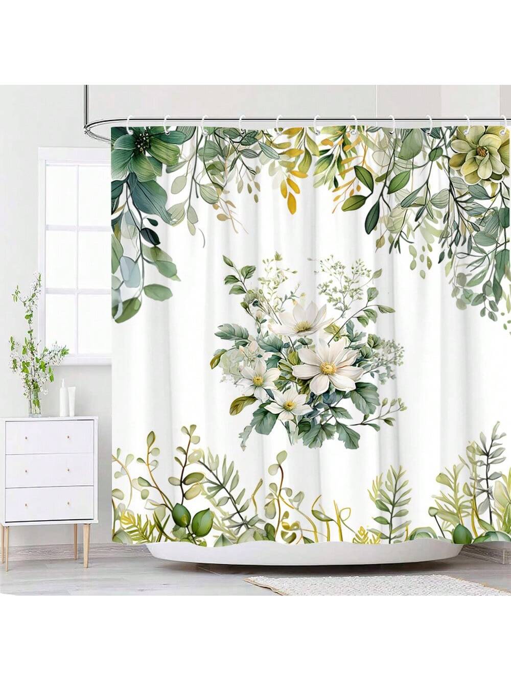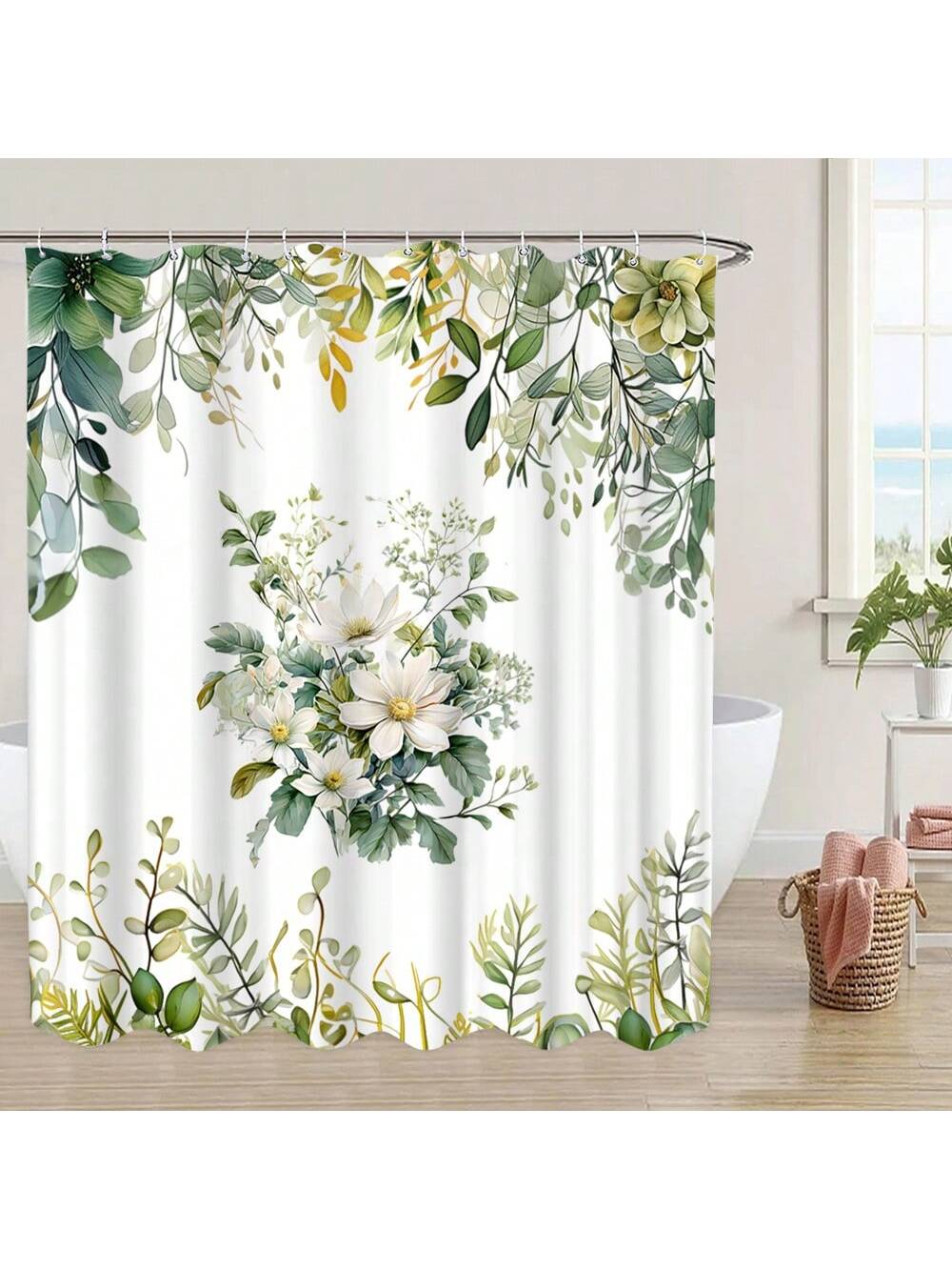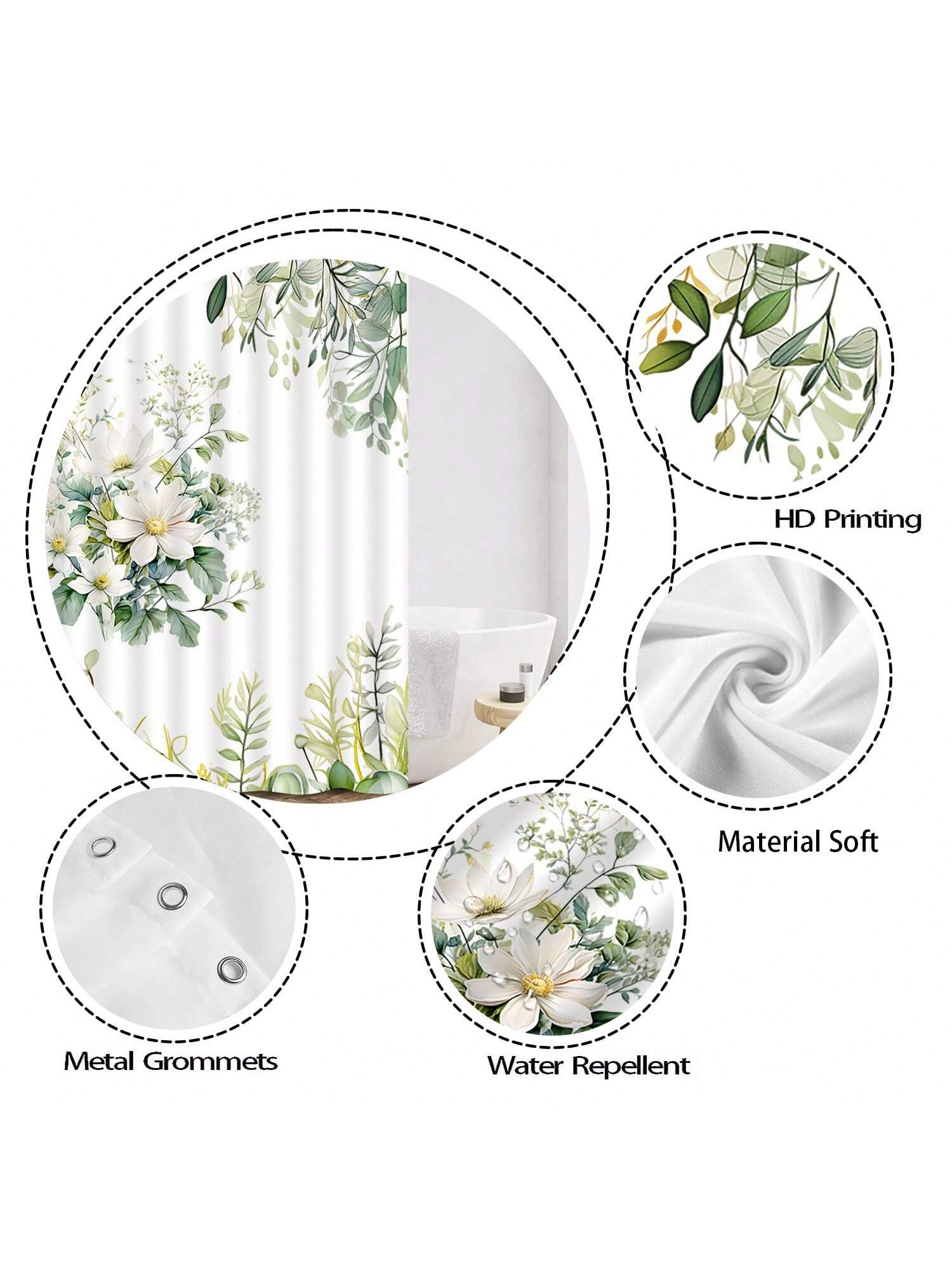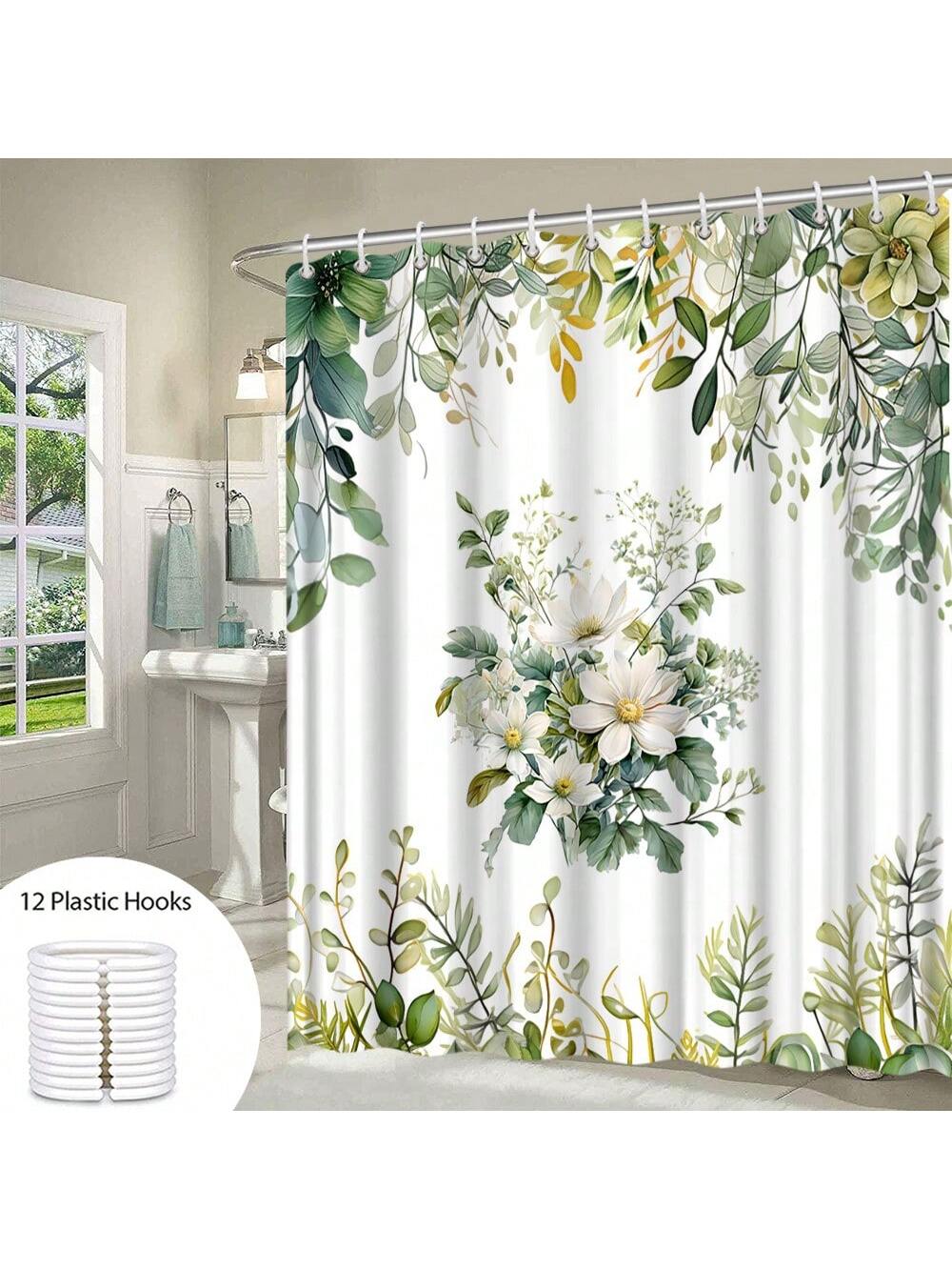 Botanical Bliss: Green Leaf & Flower Shower Curtain for a Tropical Bathroom Escape