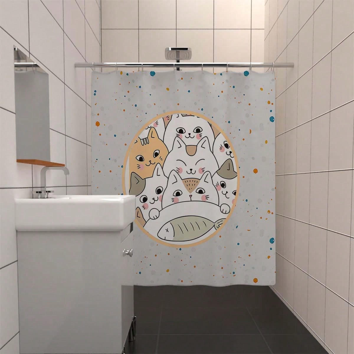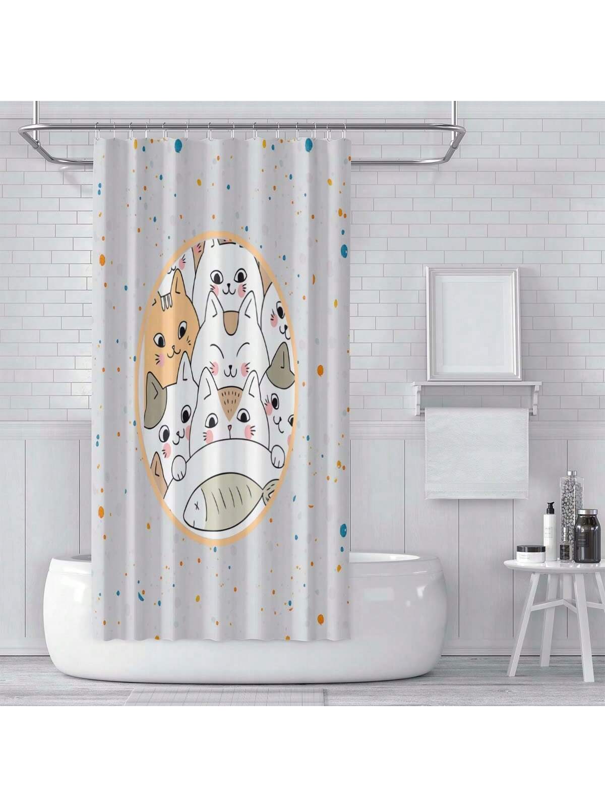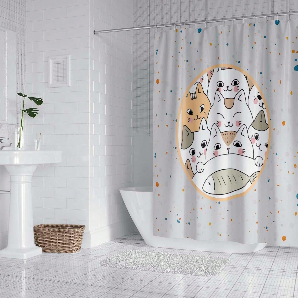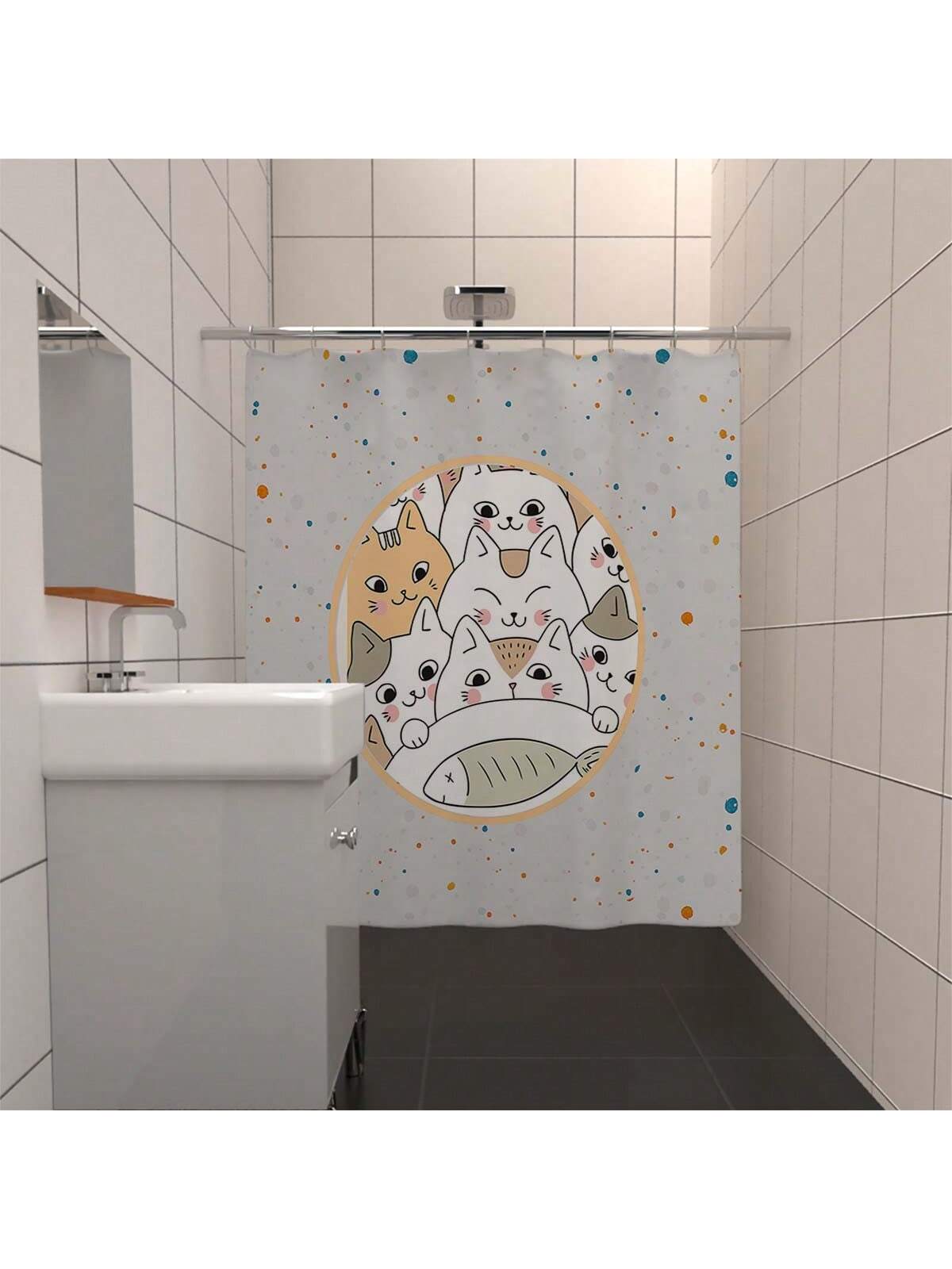 Cartoon Cat Graffiti Style Waterproof Polyester Bath Curtain - Enhance Your Bathroom with Grey Tone Design