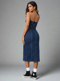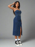 Chic and Sassy: Petite Denim Strapless Dress with Zipper Detail