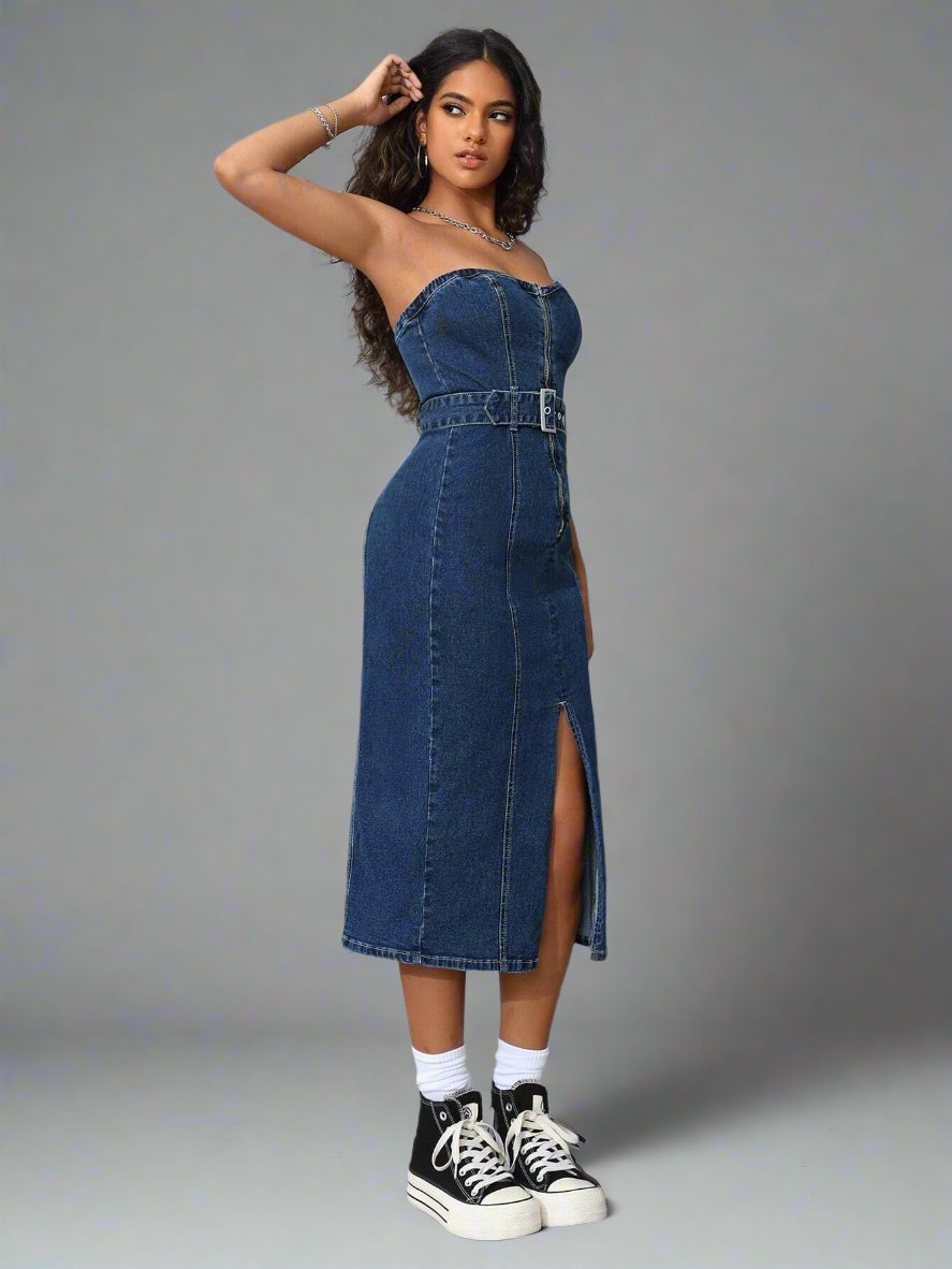 Elevate your style with our Chic and Sassy Petite Denim Strapless Dress. The sleek, zipper detail adds a touch of edginess to this classic design. Perfect for any occasion, this dress is both comfortable and fashionable, making it a versatile addition to any wardrobe.