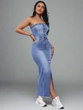 Chic and Sexy: Sleeveless Denim Maxi Dress with Slit and Bodycon Fit