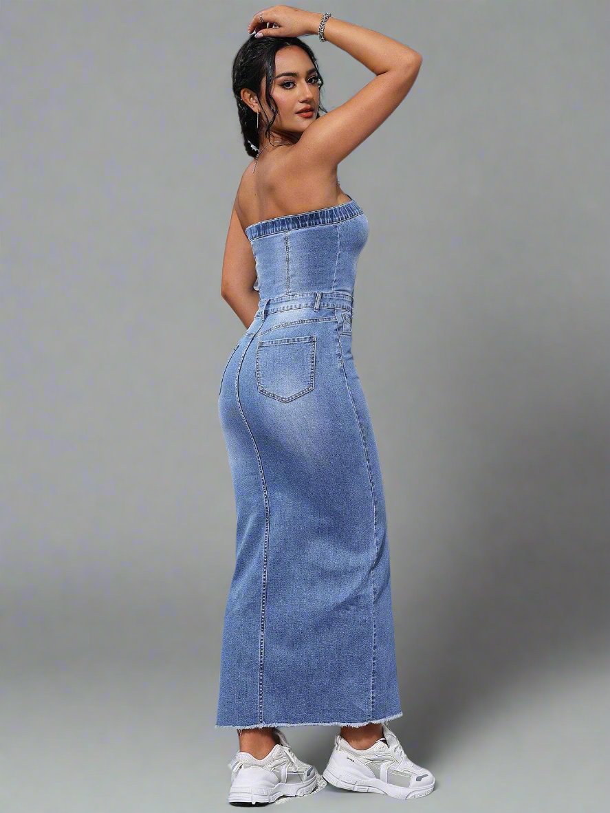 Effortlessly elevate your style with our Chic and Sexy Sleeveless Denim Maxi Dress. Show off your curves with the bodycon fit while staying cool and comfortable in the sleeveless design. Perfect for any occasion, this dress features a daring slit for a touch of sexiness.
