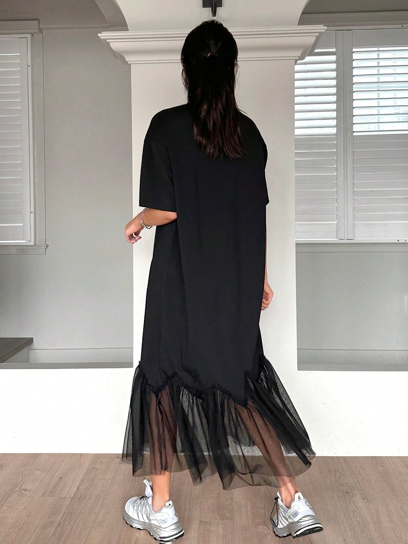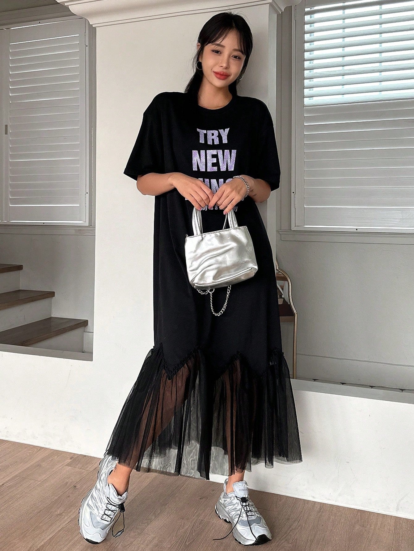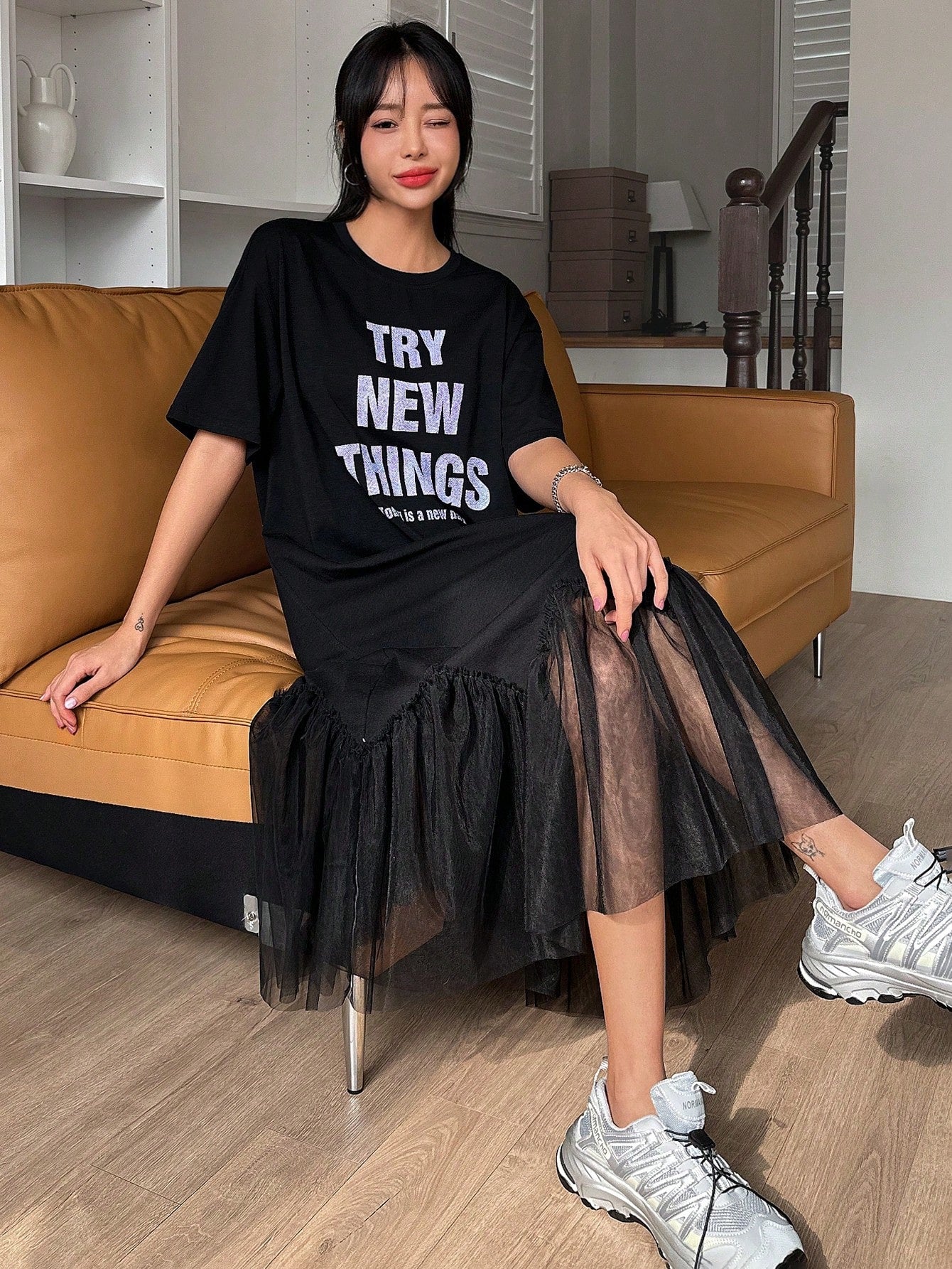 Chic and Stylish: Letter Print Mesh Patchwork Short Sleeve Dress