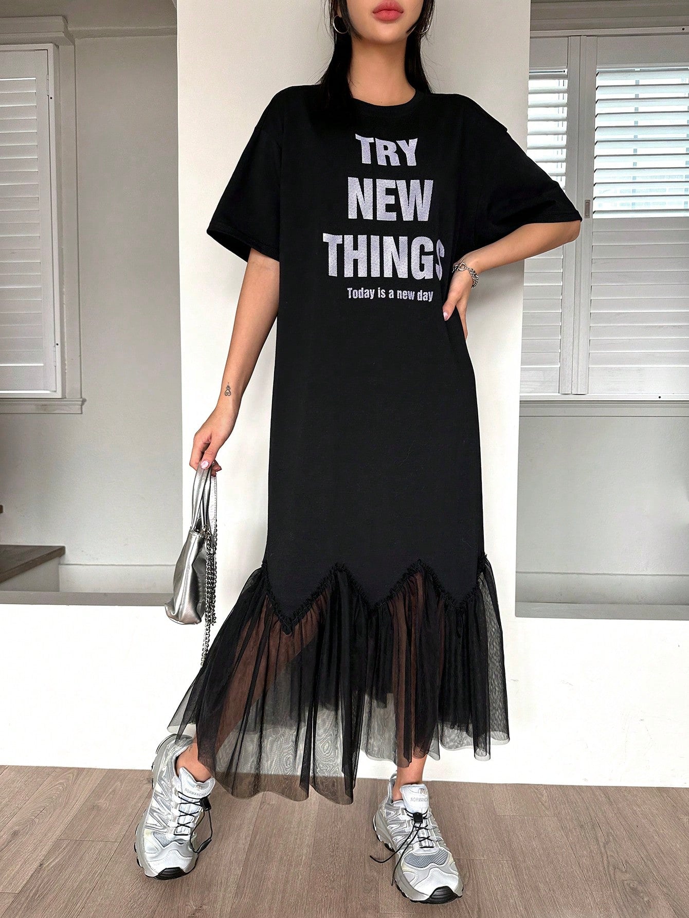 This Chic and Stylish dress features a unique letter print and mesh patchwork design on the short sleeves, adding a trendy and fashionable touch to your wardrobe. Made with high-quality materials, this dress offers both comfort and style for any occasion. Upgrade your look with this modern and eye-catching piece.
