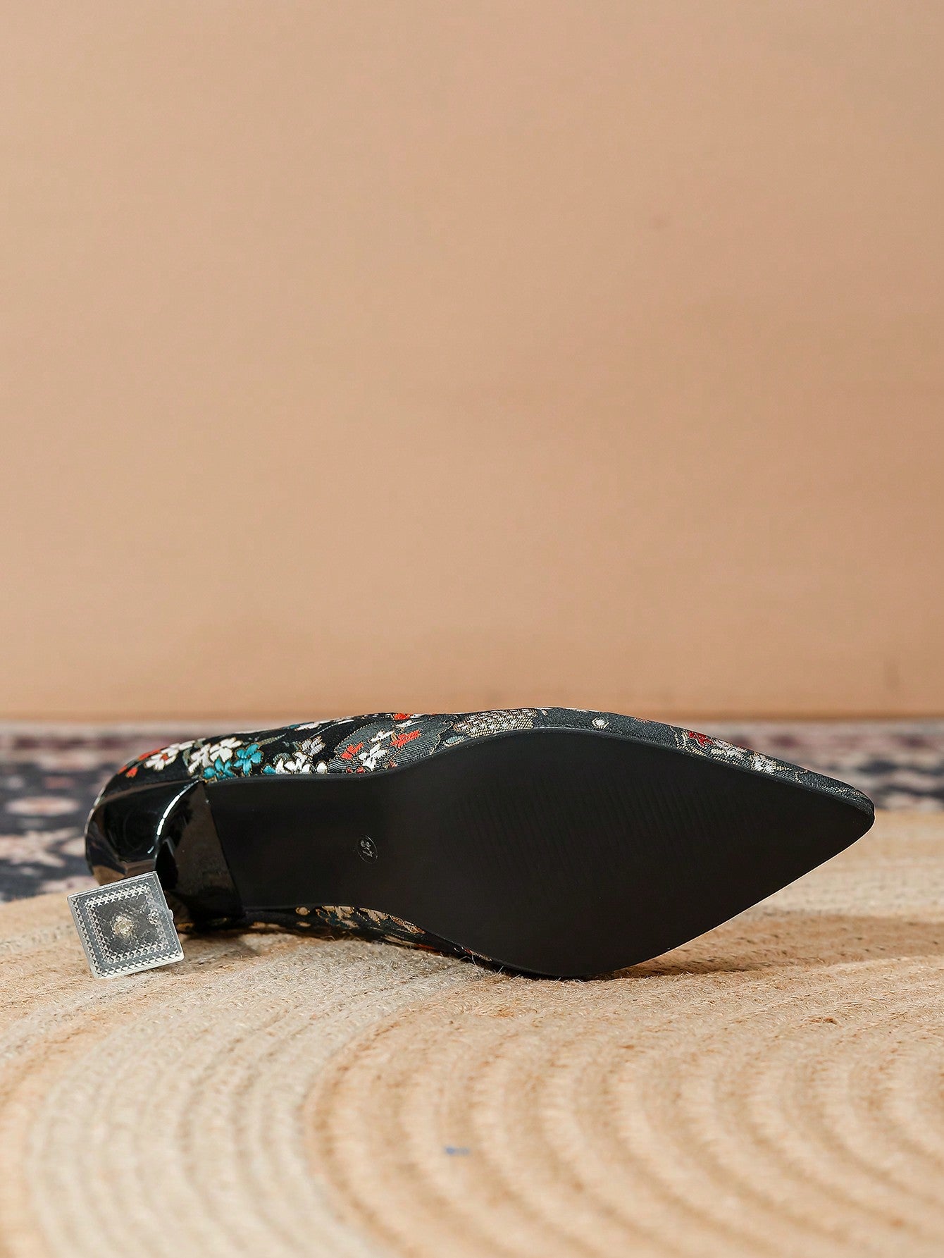Chic Black Floral High-Heel Pumps - Stylish Pointed Toe Design for Autumn Elegance