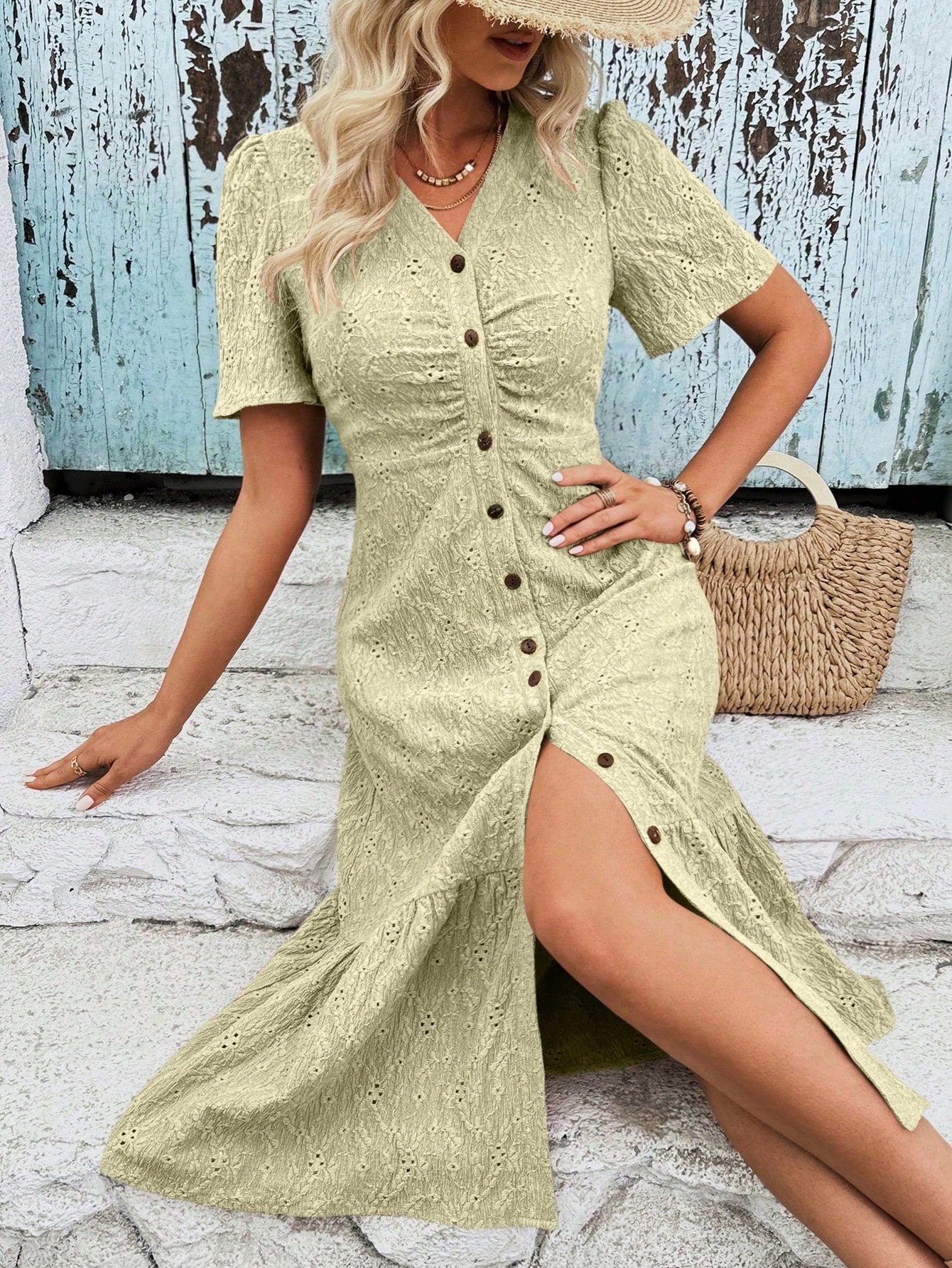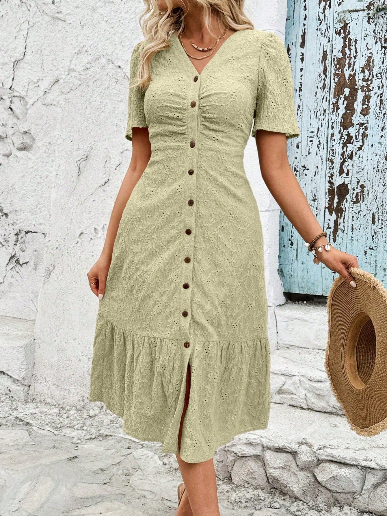 This breezy v-neck dress pairs chic style with playful details. The puff sleeves add a touch of whimsy, while the ruffle hem adds a flirty flair. Perfect for any occasion, this dress will have you feeling effortlessly stylish and carefree.