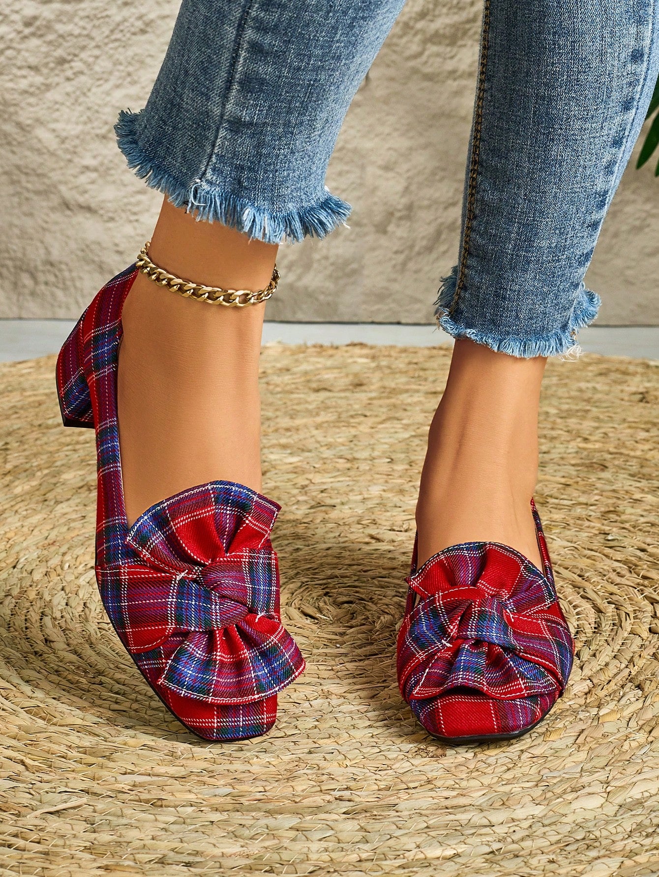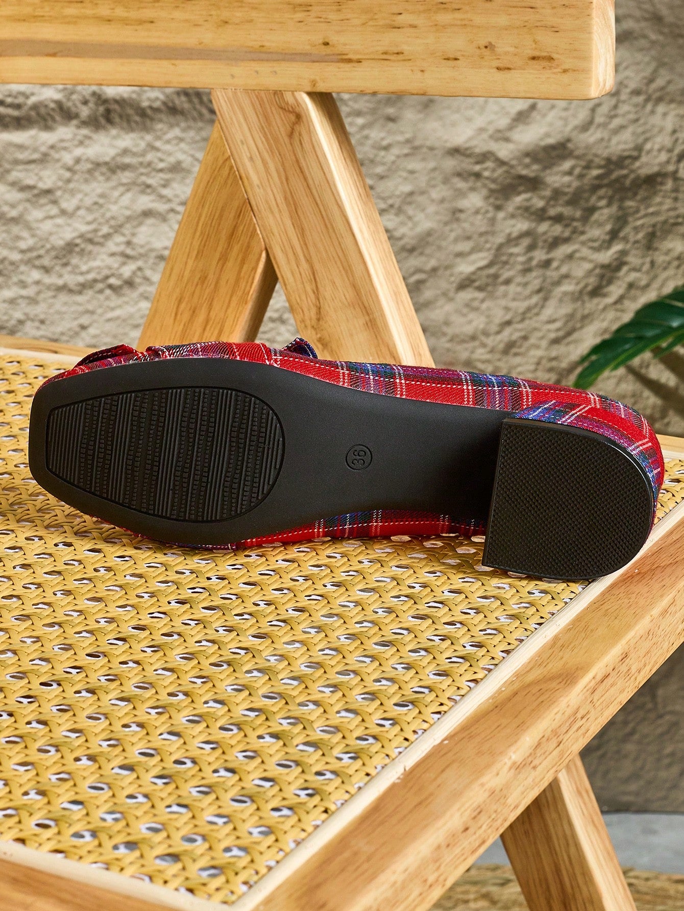 Chic Deep Red Plaid & Floral Print Ballet Flats for Autumn/Winter