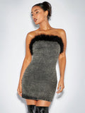 Chic Feather-Trimmed Denim Bodycon Dress for Effortless New Year's Eve Glam