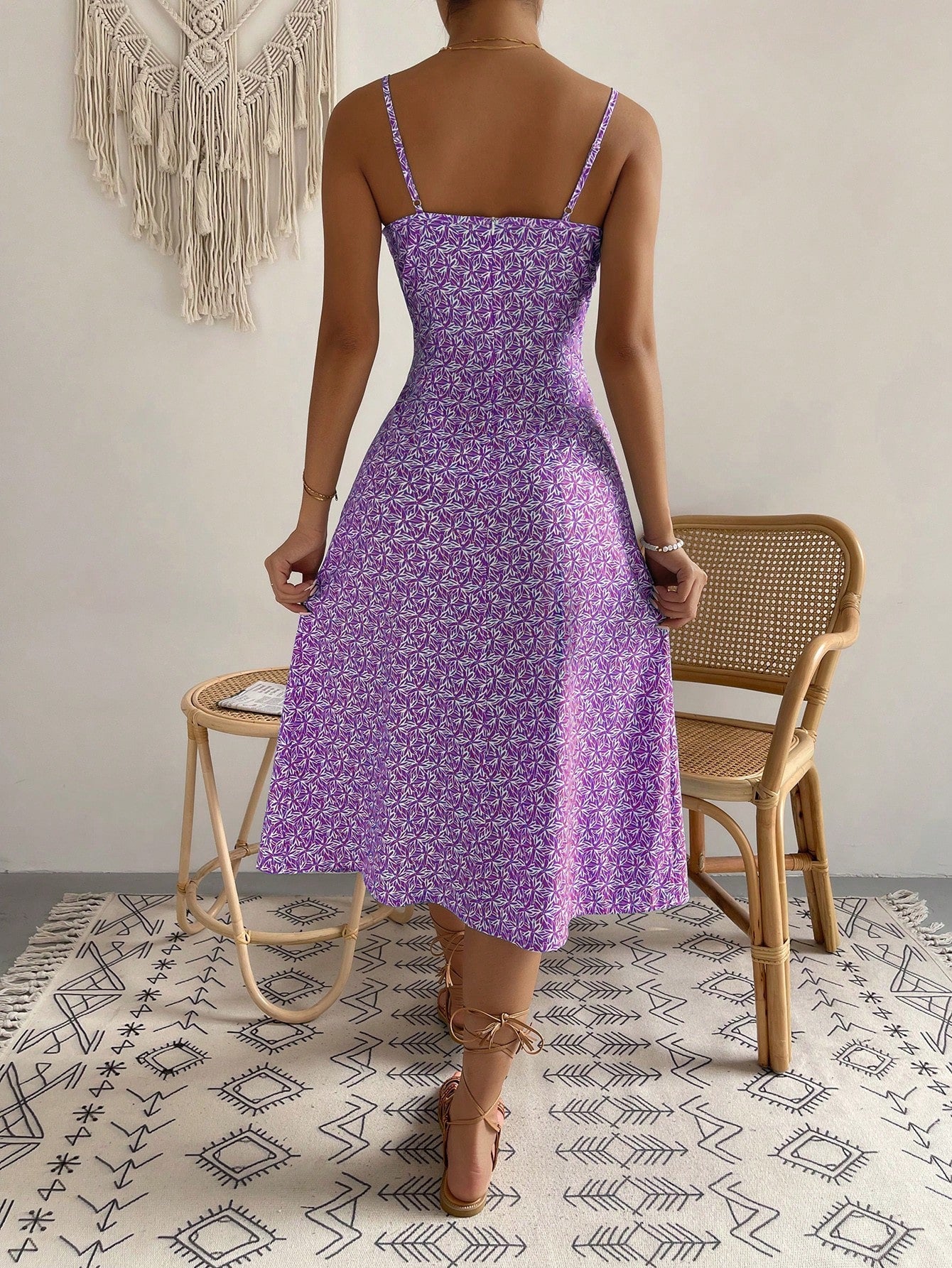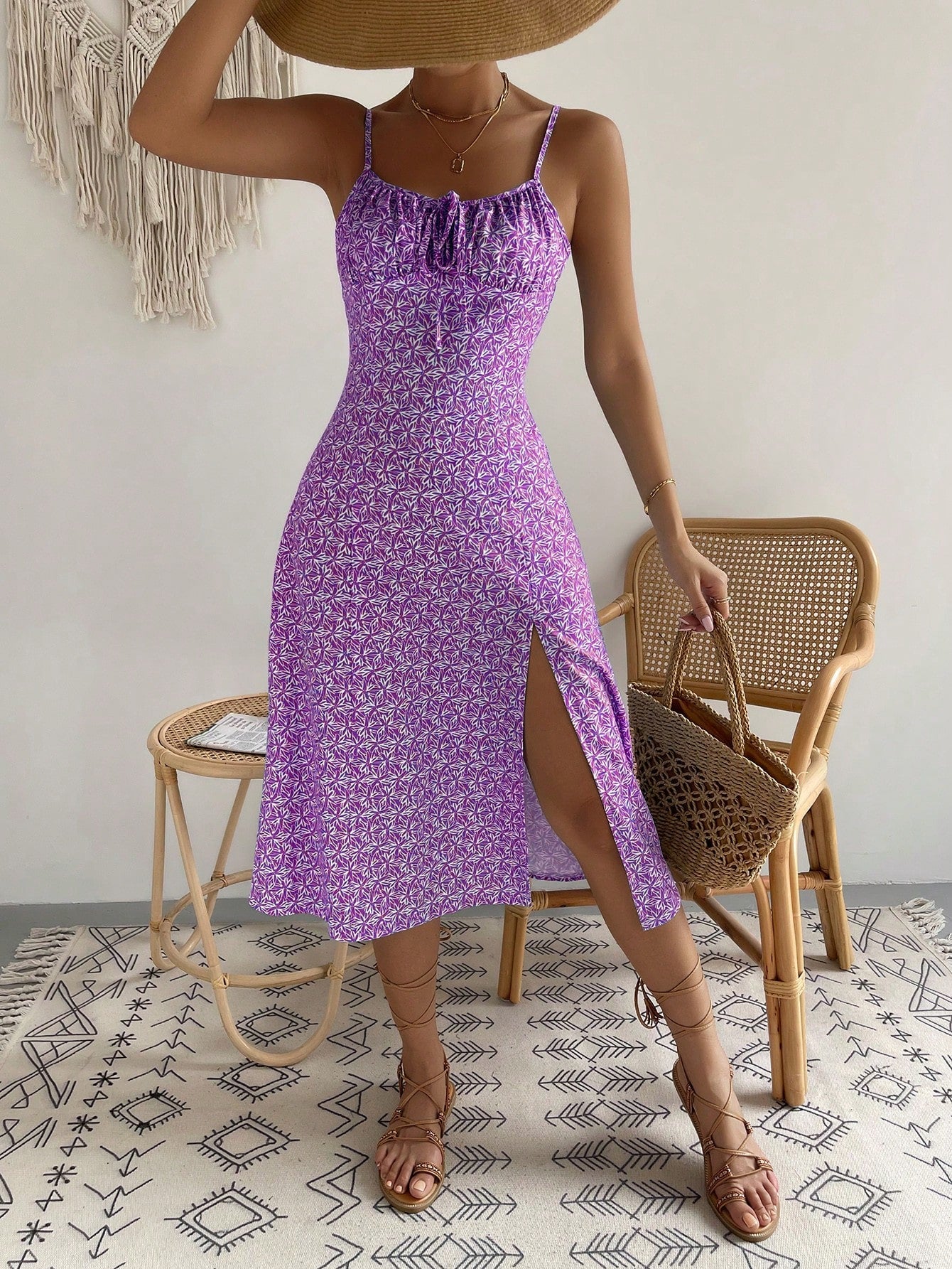 Chic Floral Print Knot Front Cami Dress with Split Thigh