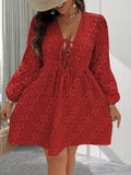Designed for plus size women, this mini dress features a chic floral print and a lace-up design along with long sleeves. Perfect for any occasion, this dress showcases your curves and enhances your overall style. Made from high-quality materials, it offers both comfort and fashion.