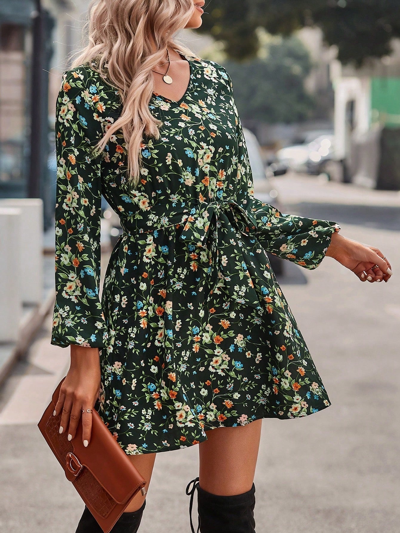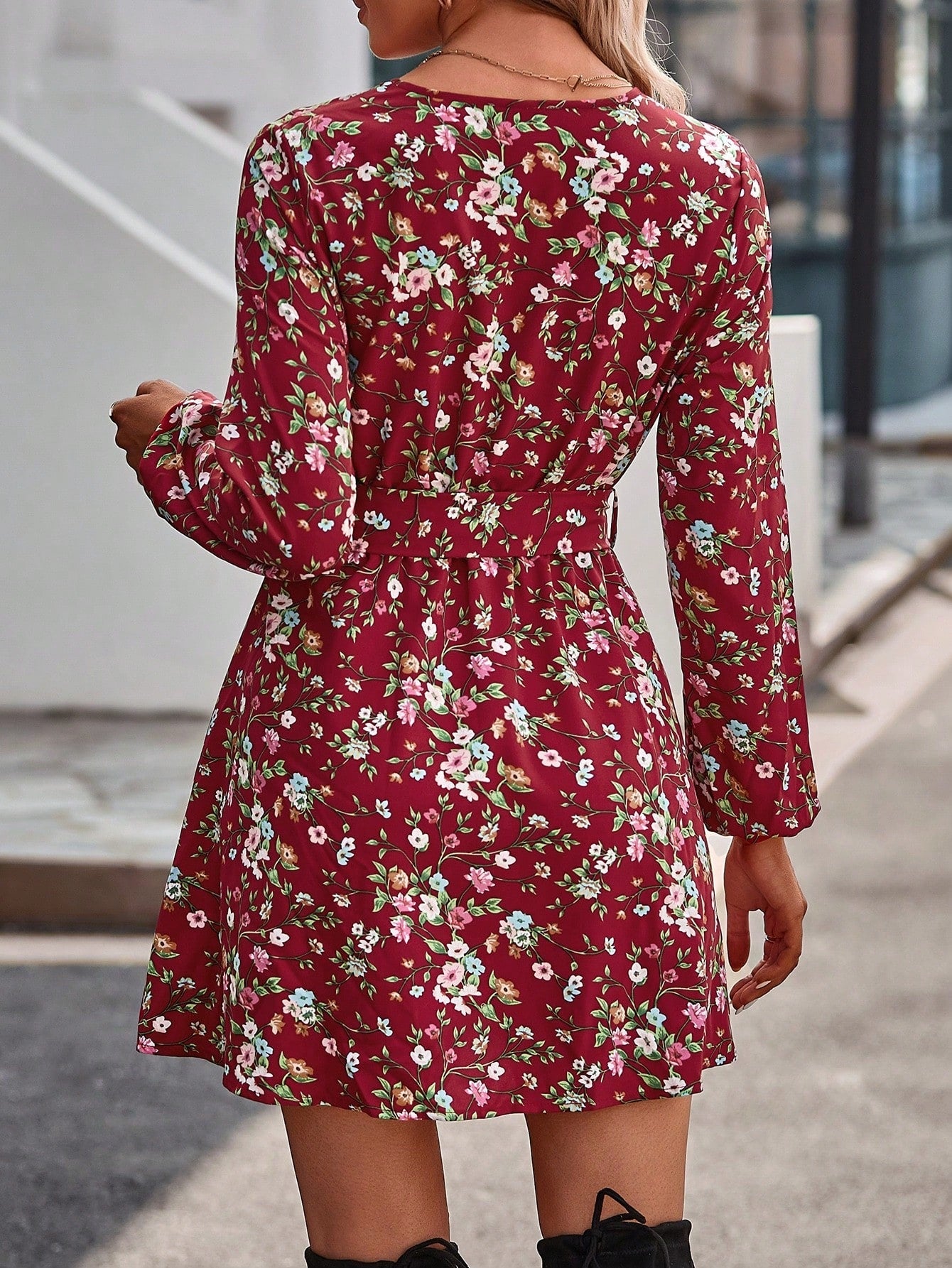 Chic Floral V-Neck Midi Dress with Waist Belt – Perfect for Every Occasion