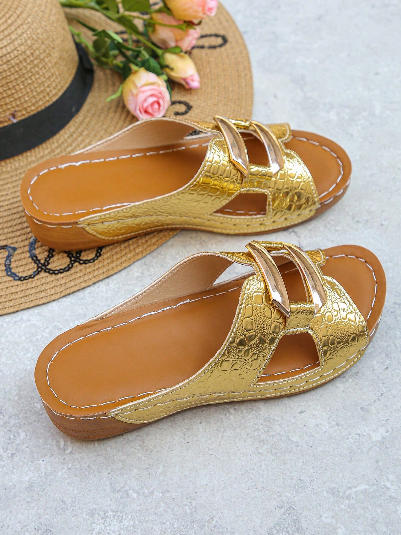 Elevate your summer style with these chic gold platform wedge sandals. Featuring a trendy crocodile pattern and metal accents, these sandals offer both fashion and function. The platform wedge provides added height and comfort, while the crocodile pattern adds a touch of edginess. Perfect for any summer outfit.