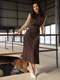This Chic High-Neck Shoulder Pad Dress is perfect for professional workwear. Its sophisticated high-neck design and shoulder pads provide a polished and confident look that is sure to make a statement. Add this dress to your wardrobe for a touch of elegance and style in the workplace.