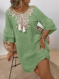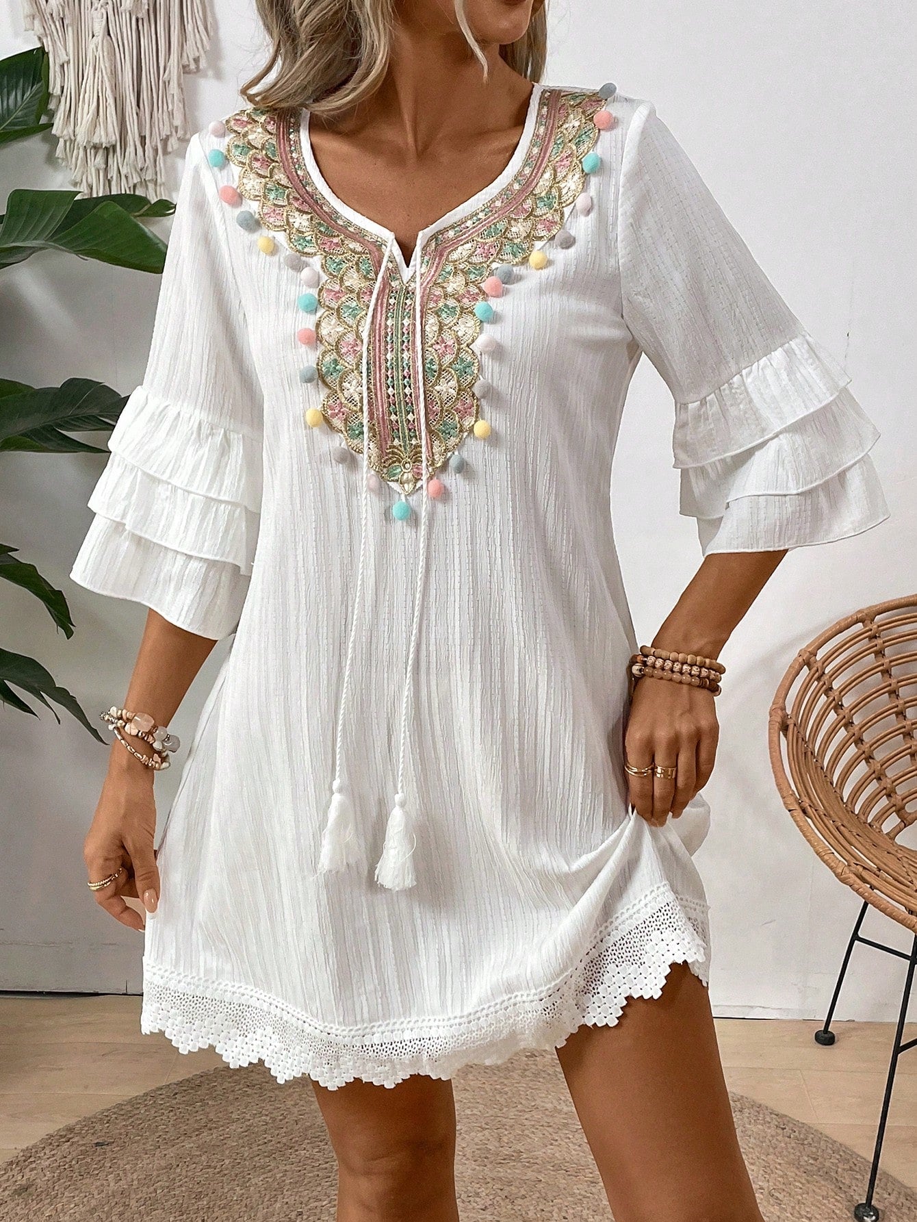 Chic Holiday Floral Embroidery Dress with Tassel Ties and Pom-Pom Details
