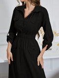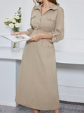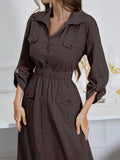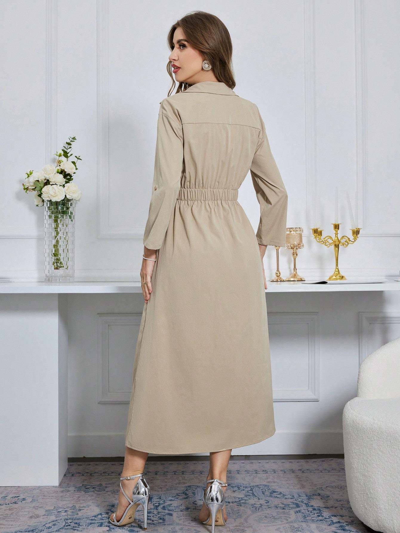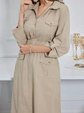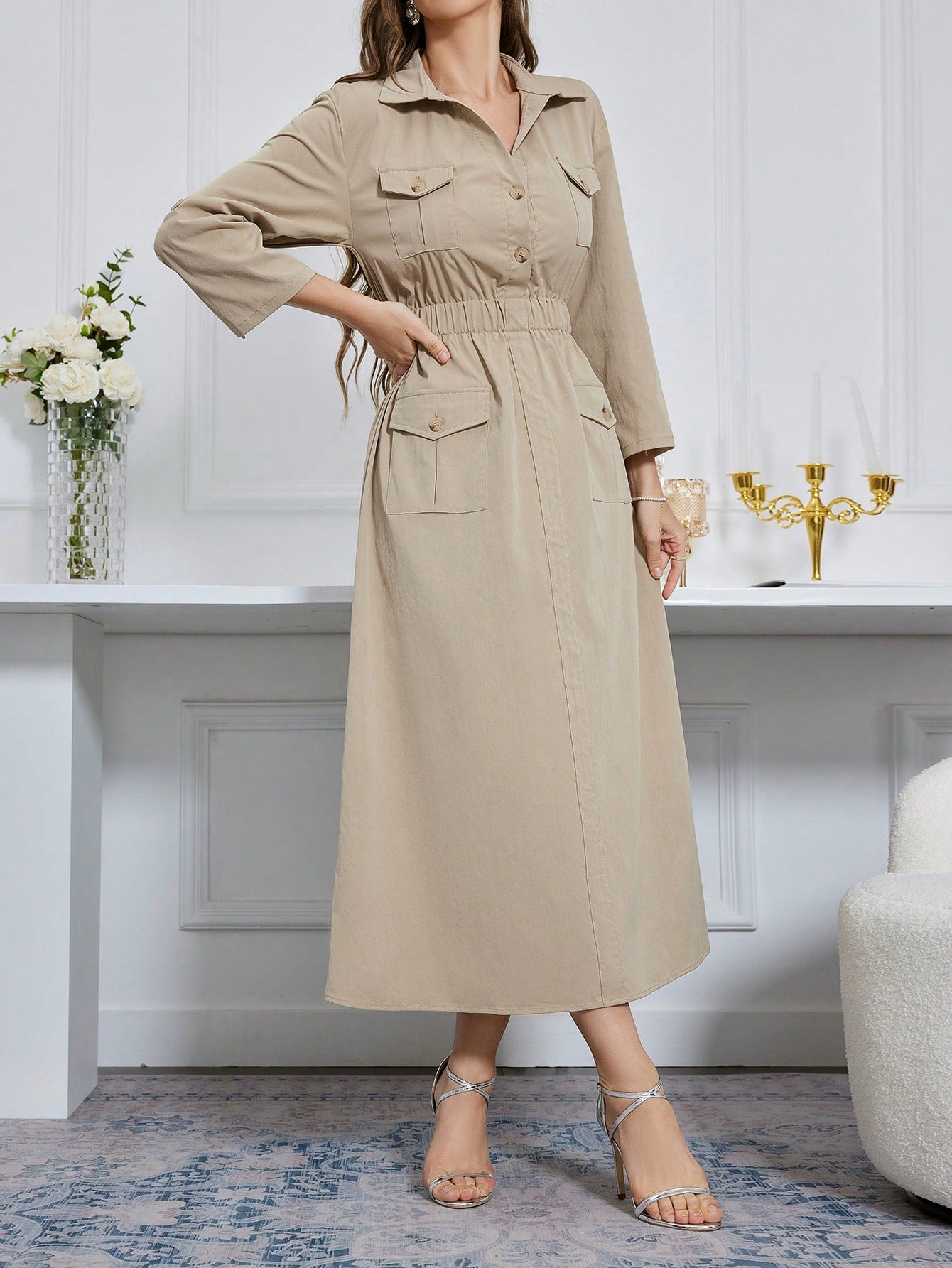 Chic Khaki Button-Front Dress with Cinched Waist and Pockets for Effortless Style