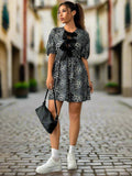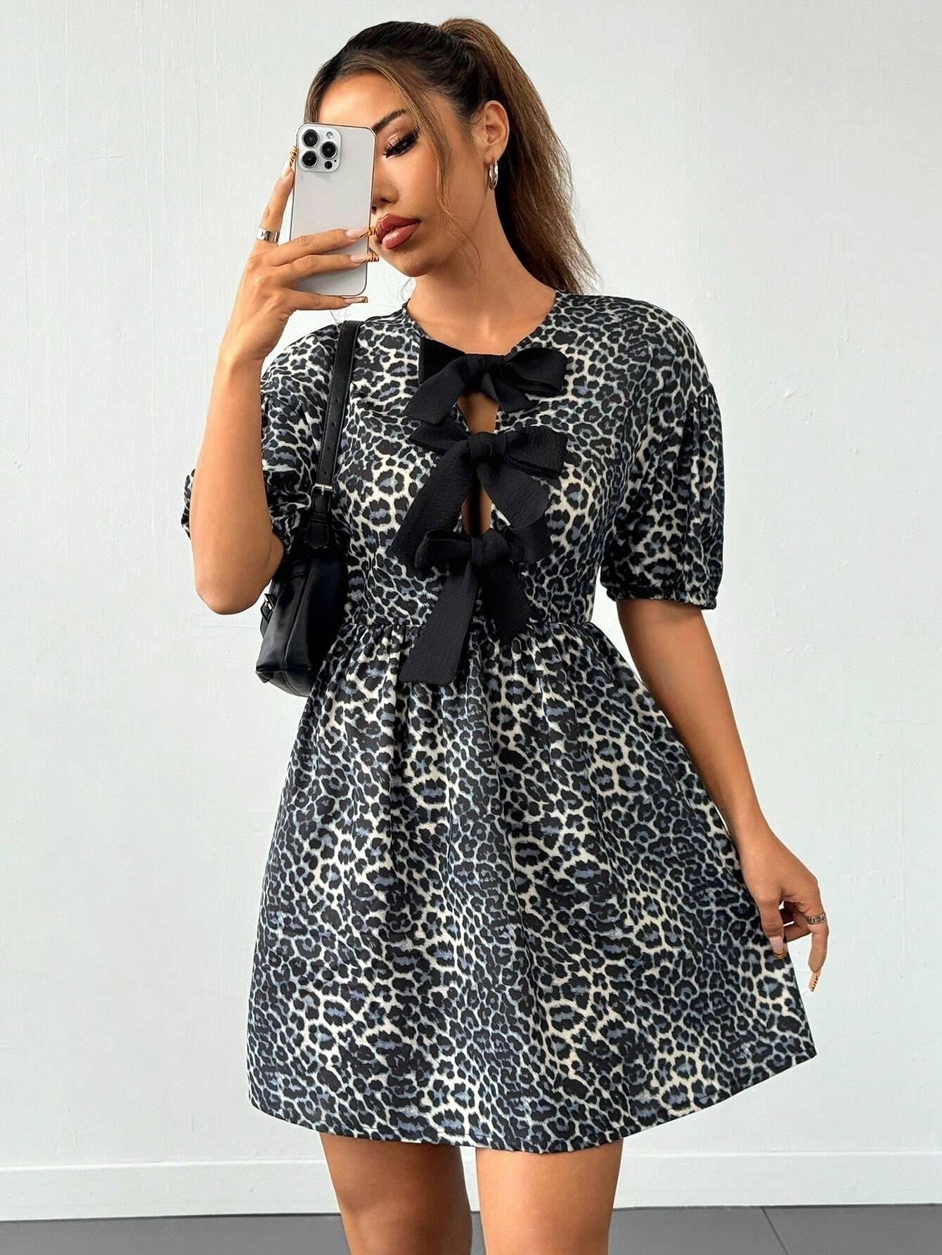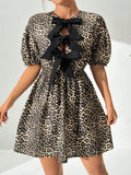 Chic Leopard Print Half-Sleeve Dress with Bow Tie Detail