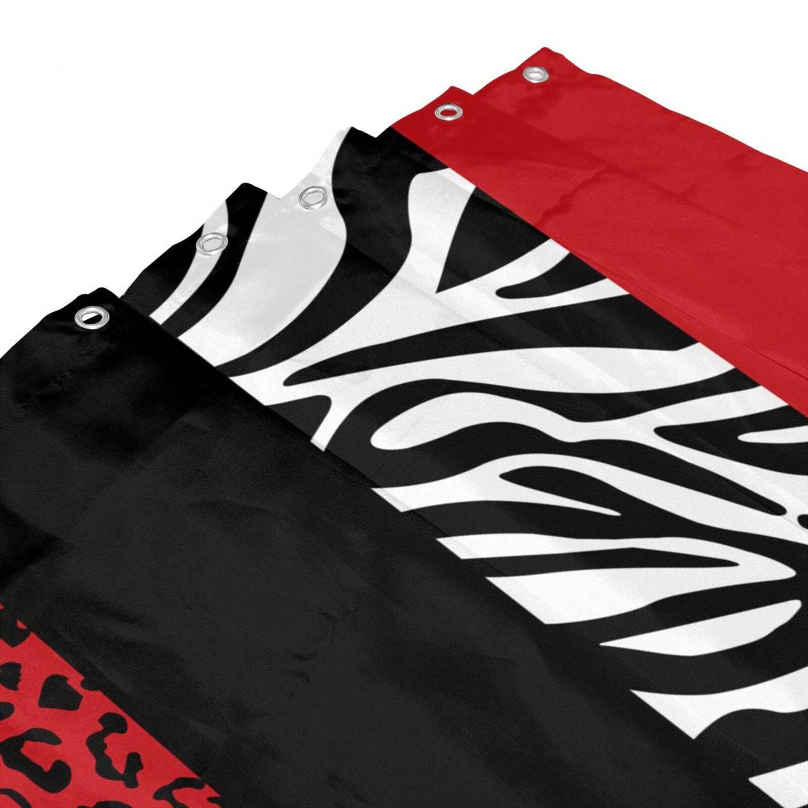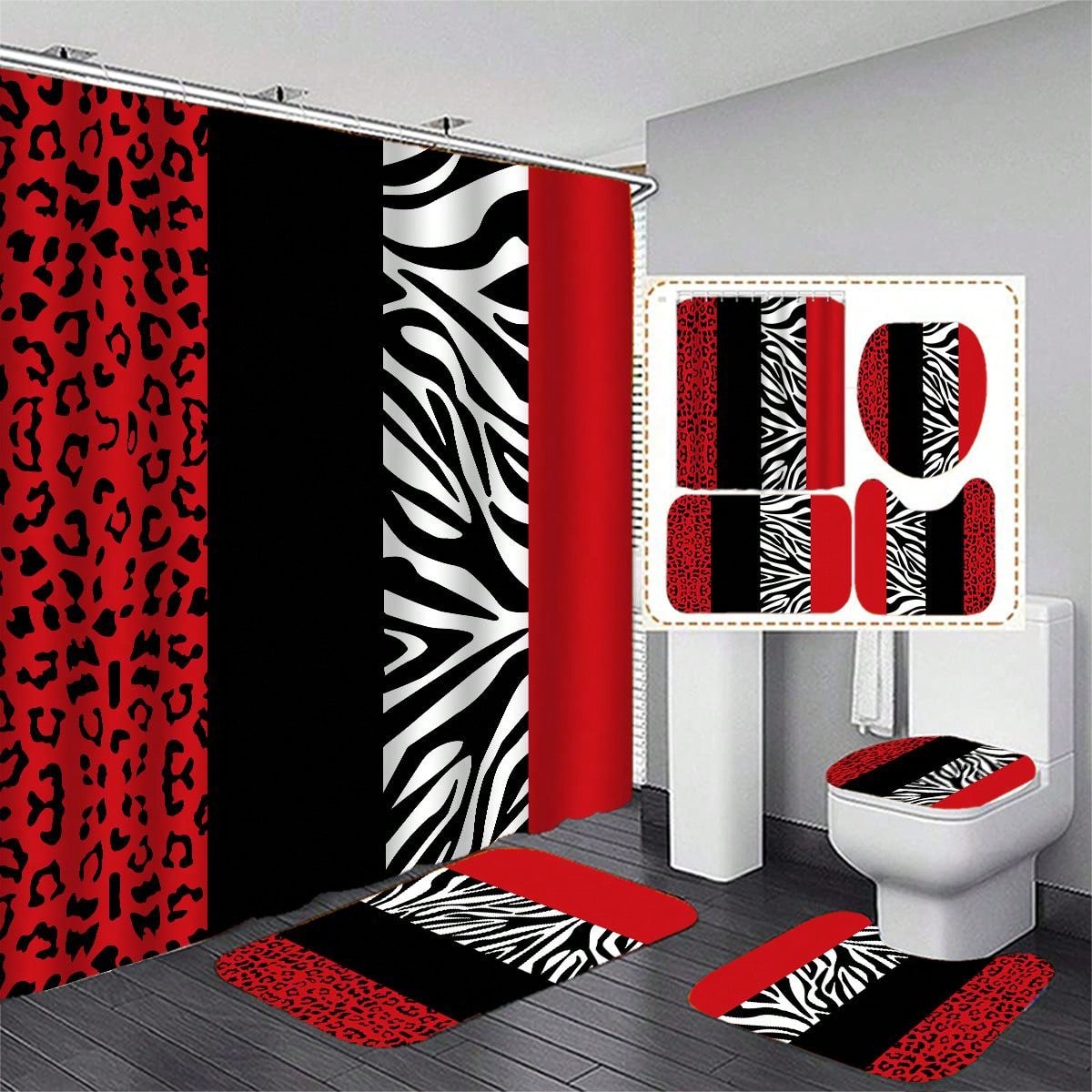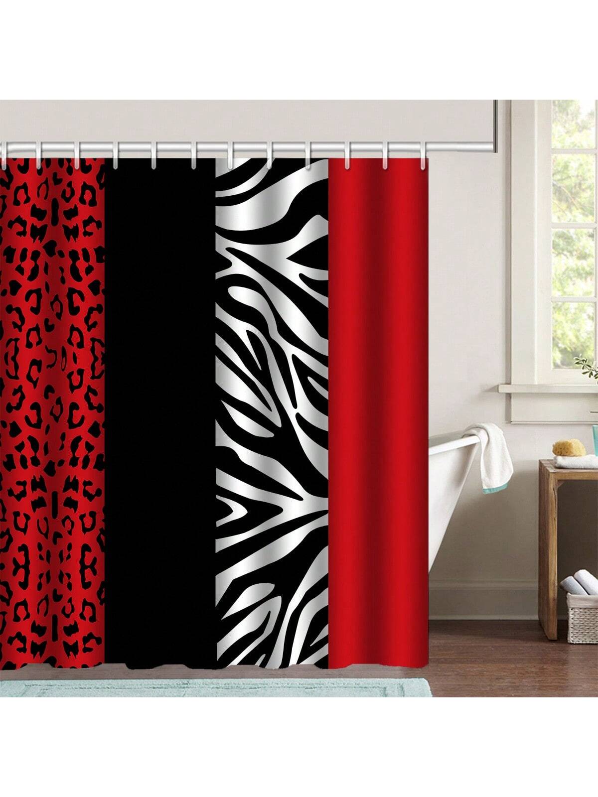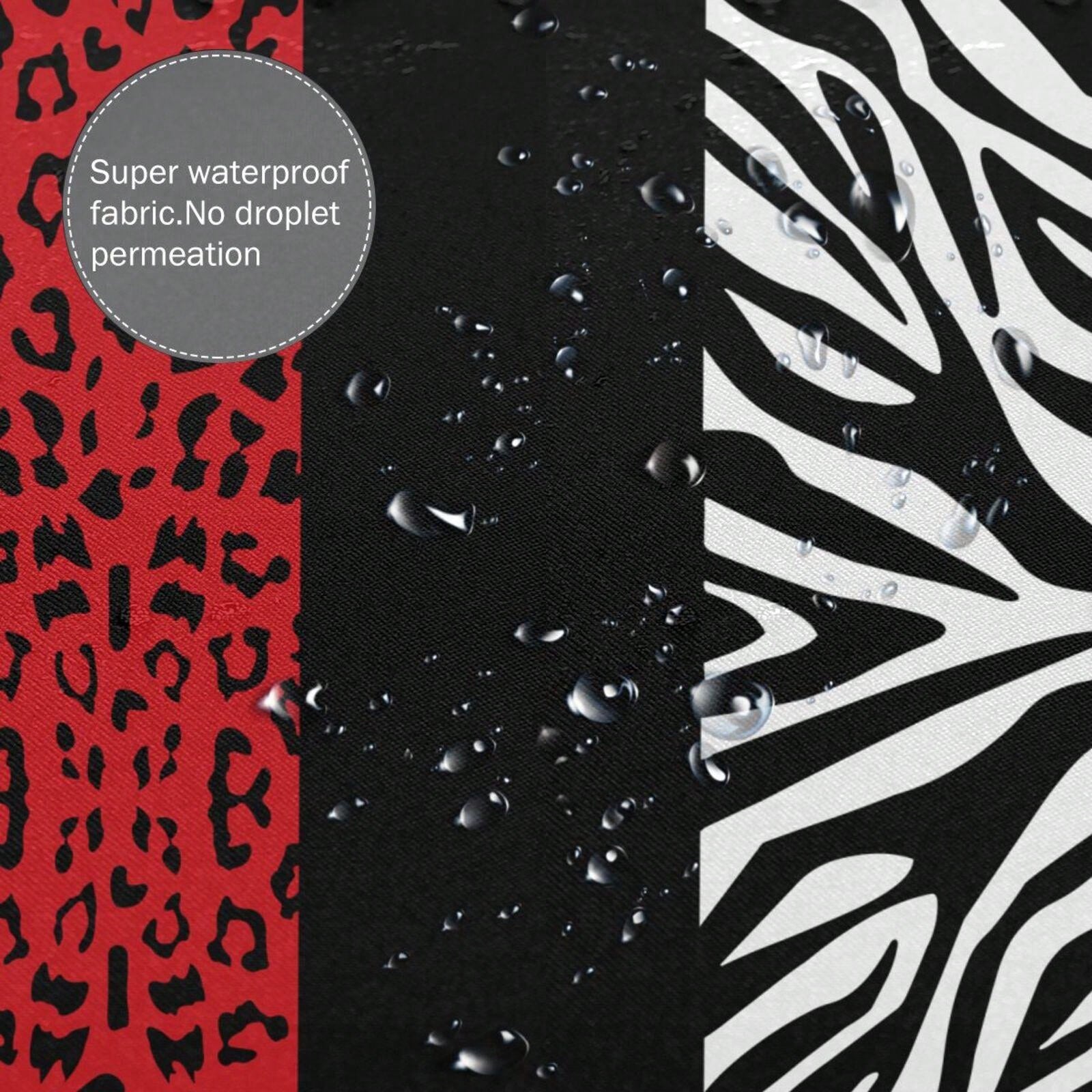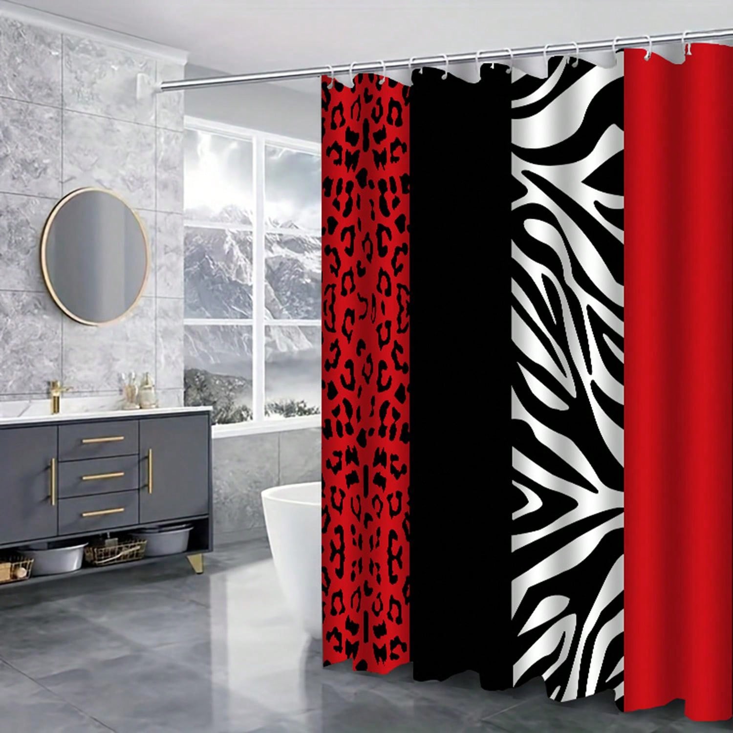Chic Leopard Print Shower Curtain Set – Black & White with Red Stripes | Stylish Bathroom Decor