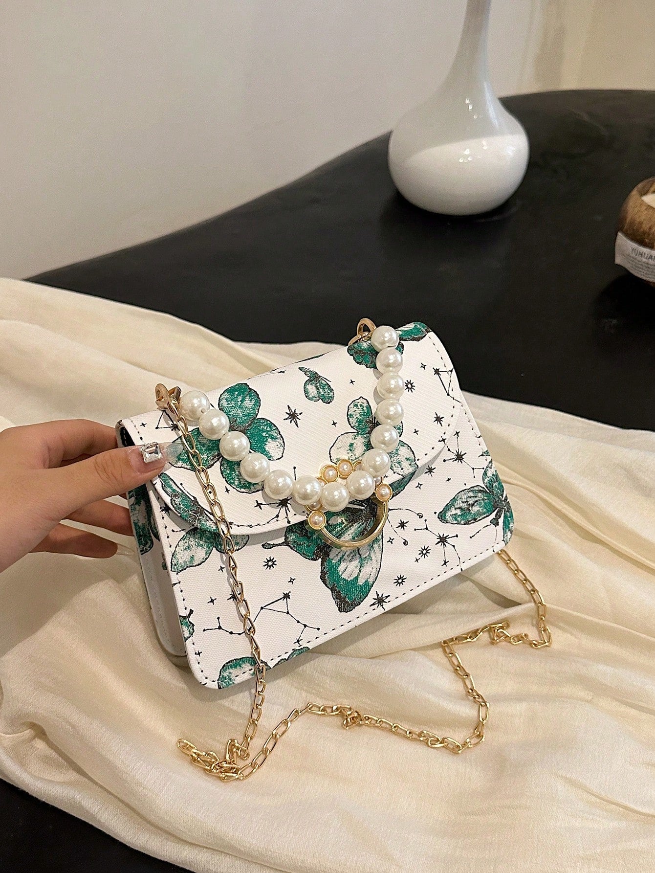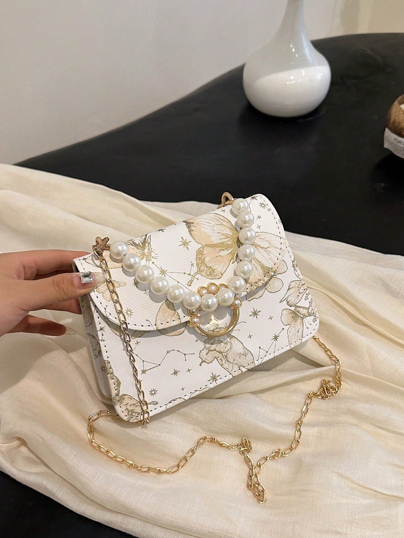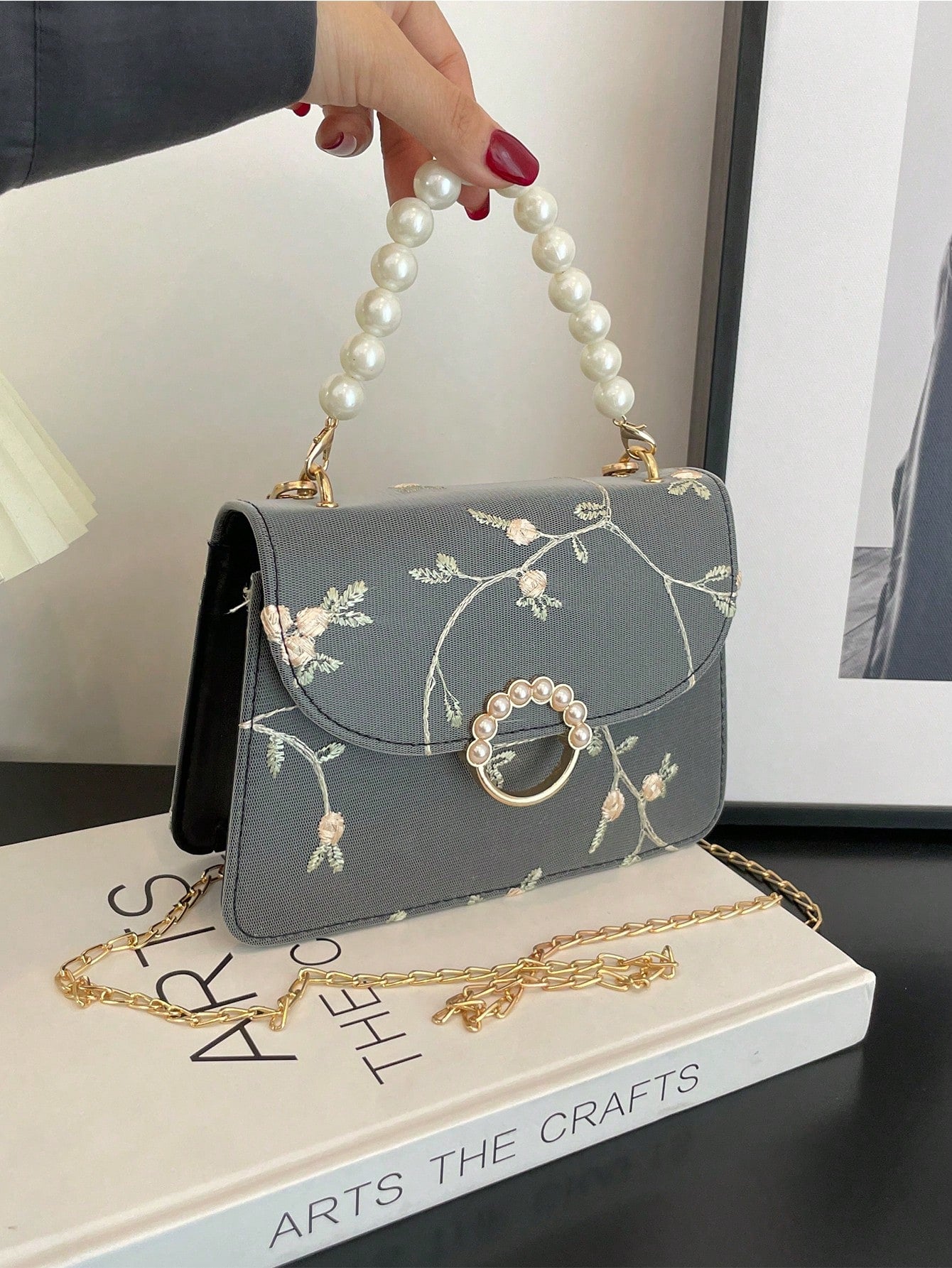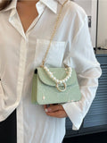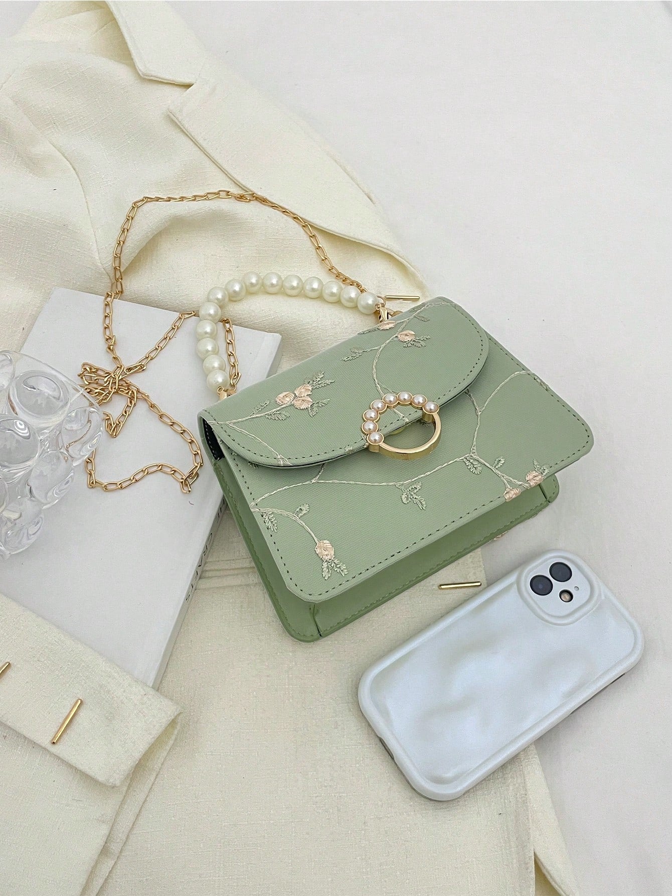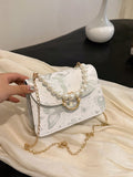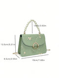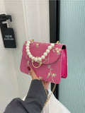 Chic Mini Square Bag with Flower Embroidery & Faux Pearl Accents