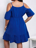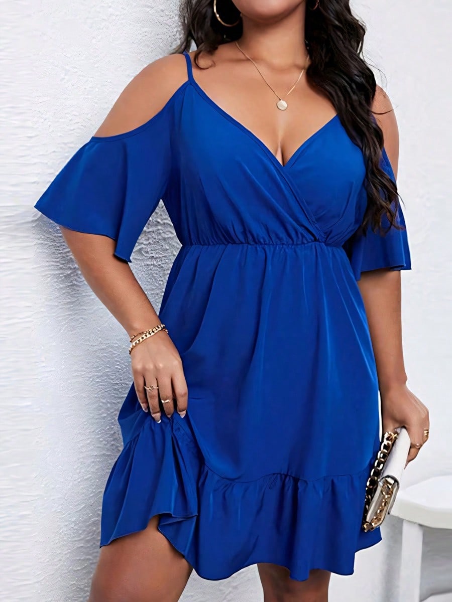 Stay effortlessly chic with our oversized cold shoulder dress. The elegant V-neck and waist belt add a touch of sophistication to this commuter style dress. Say goodbye to boring work attire and hello to stylish comfort.