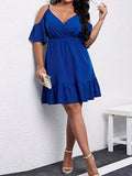 Chic Oversized Cold Shoulder Dress with Waist Belt - Elegant V-Neck Commuter Style