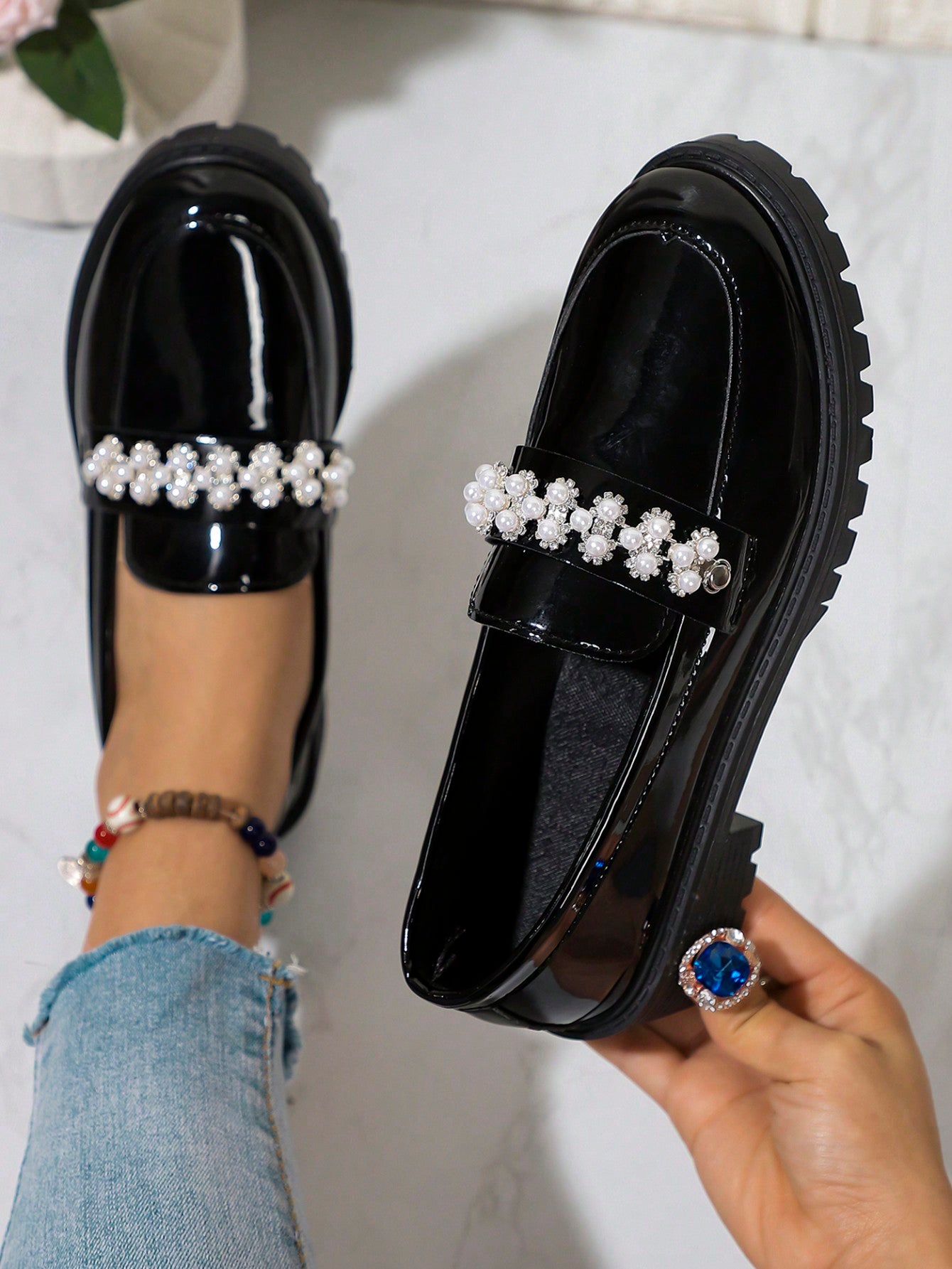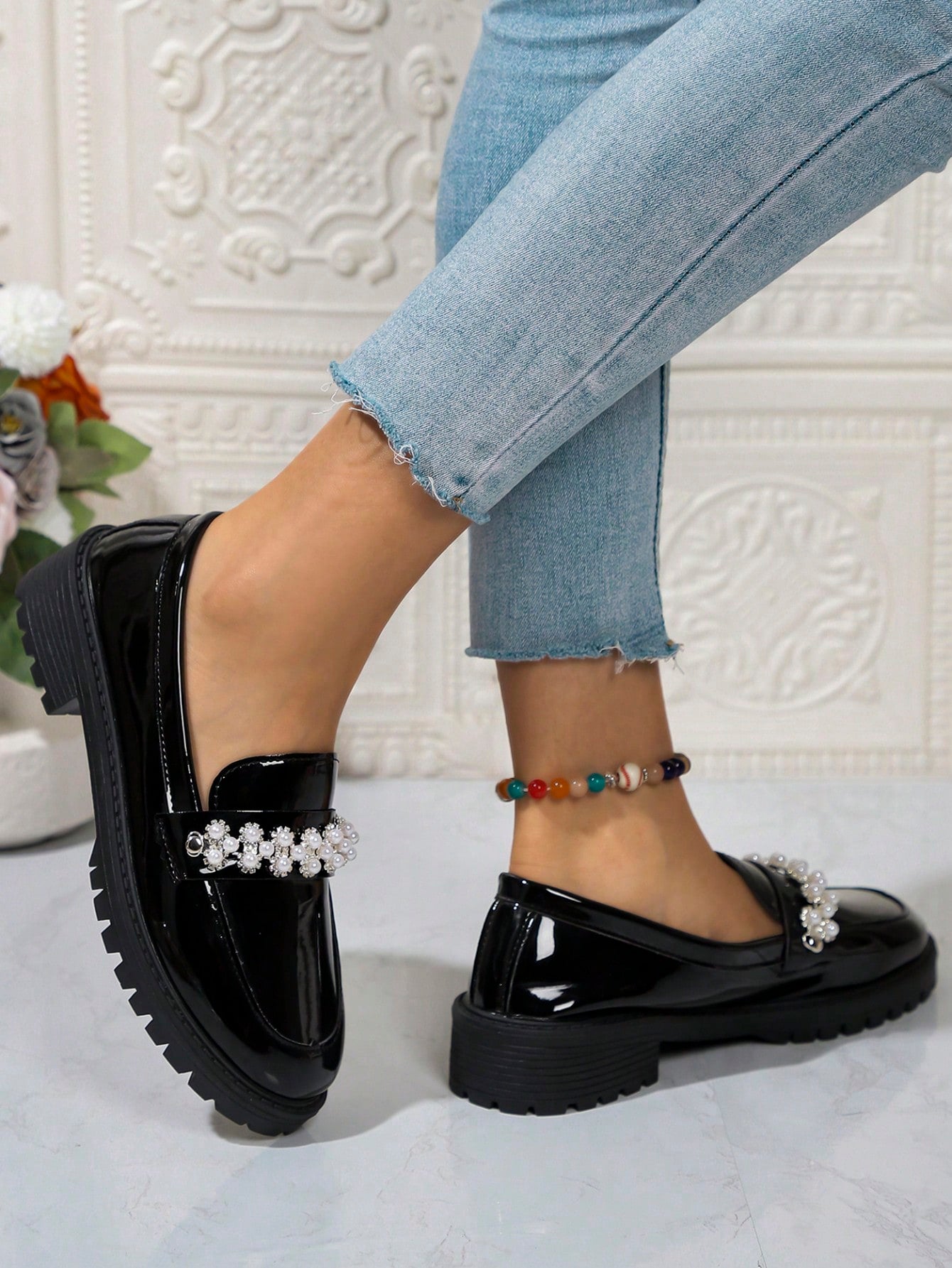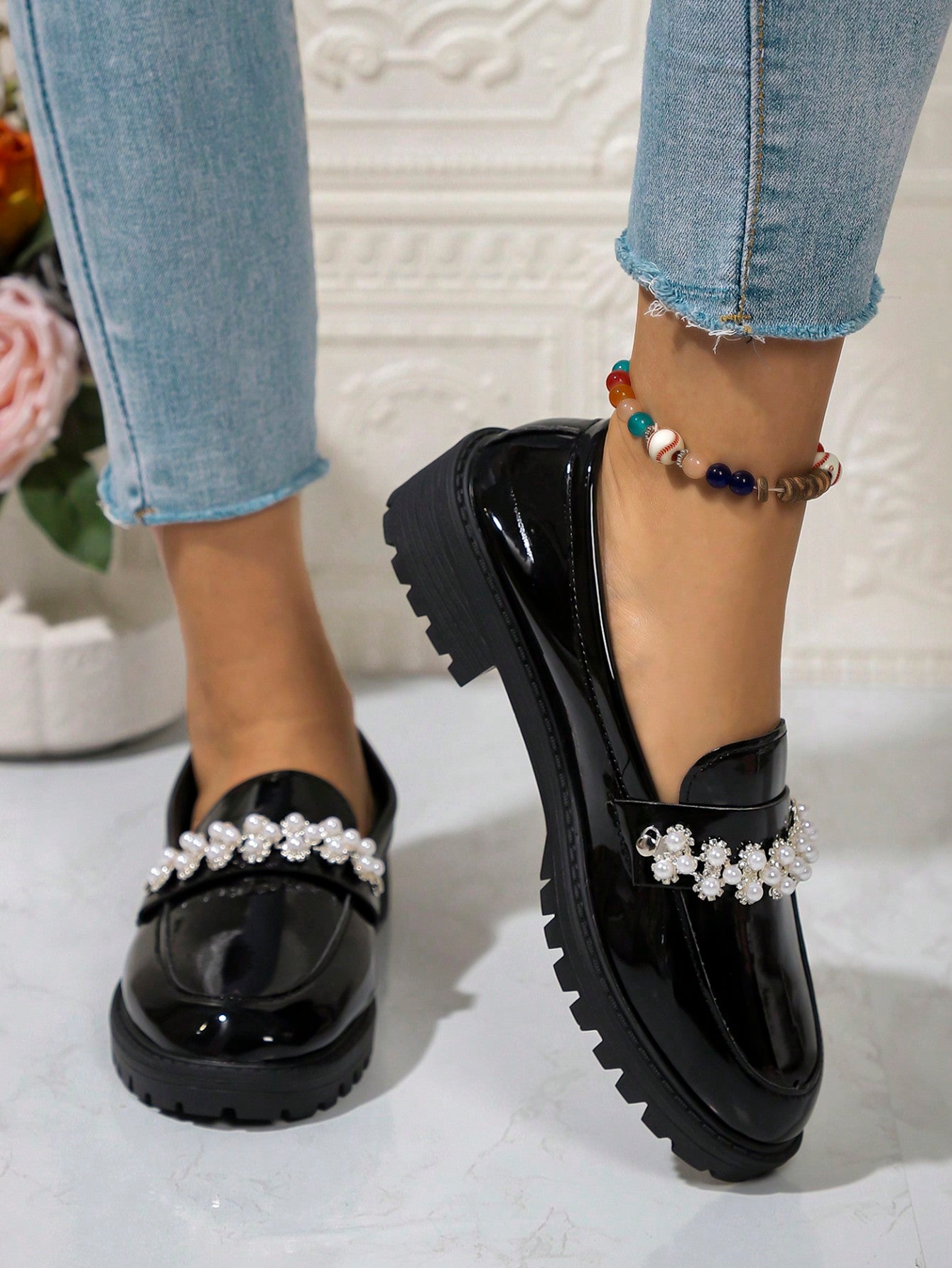 Chic Pearl-Embellished Chunky Platform Loafers – Trendy British Style for Fall/Winter 2024
