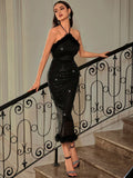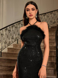 Chic Petite Furry Sequin Halterneck Dress for Elegant Holiday Celebrations