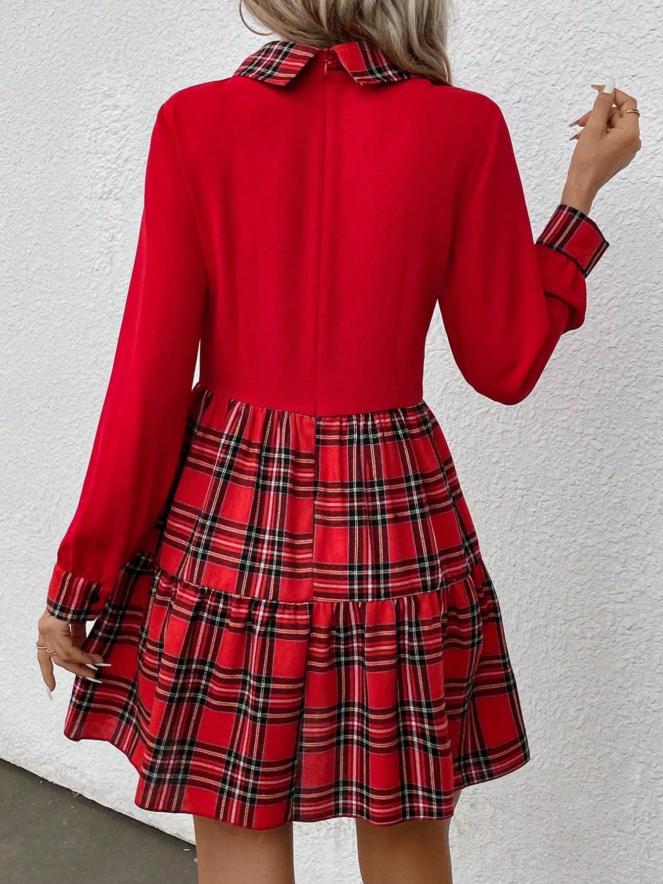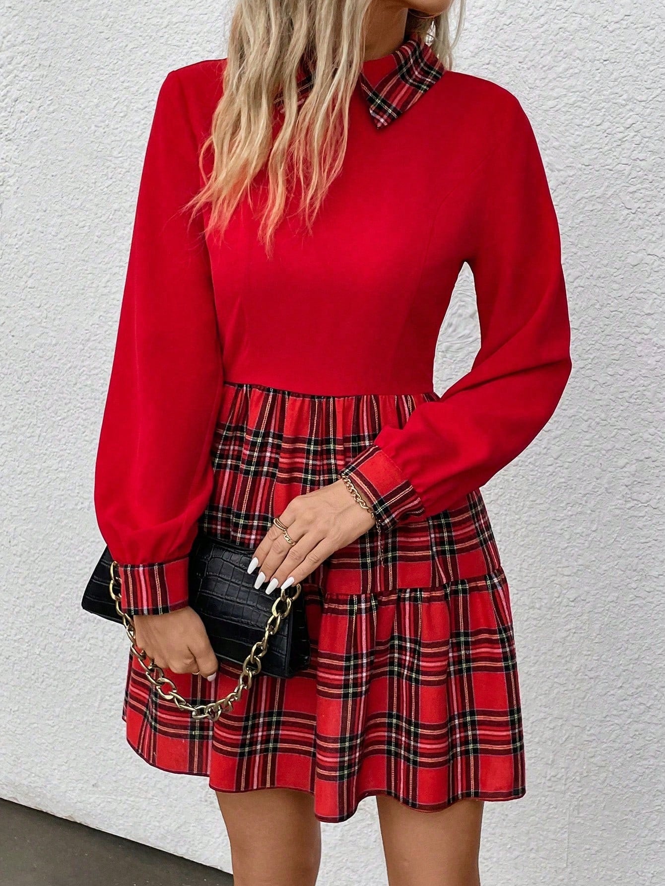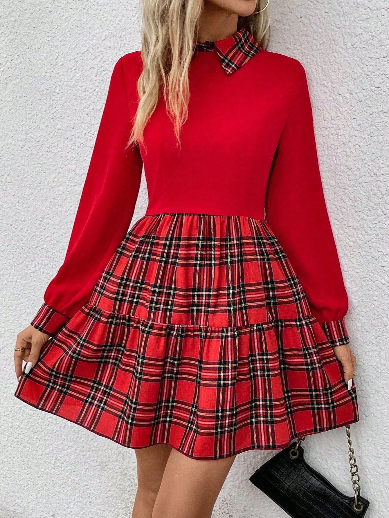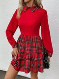 Chic Plaid Print Lapel Collar Long Sleeve Dress for Elegant Style
