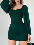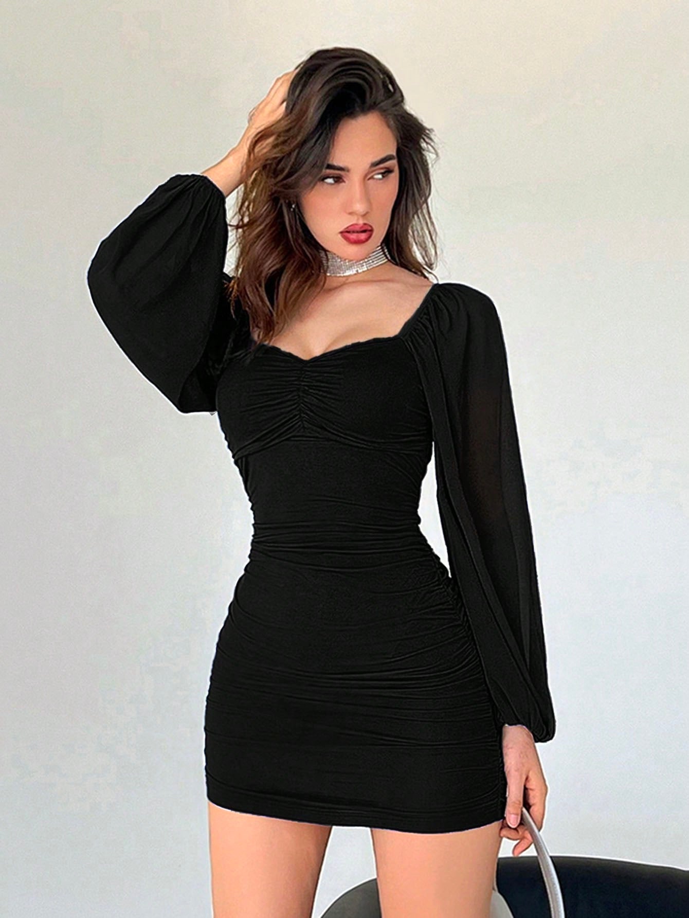 Elevate your style with our Chic Pleated Bodycon Dress featuring elegant Lantern Sleeves. The pleated design flatters your figure for effortless elegance. Perfect for any occasion, this dress is sure to turn heads. (Fashionable and flattering! Stand out in style with the Chic Pleated Bodycon Dress and its unique Lantern Sleeves.)