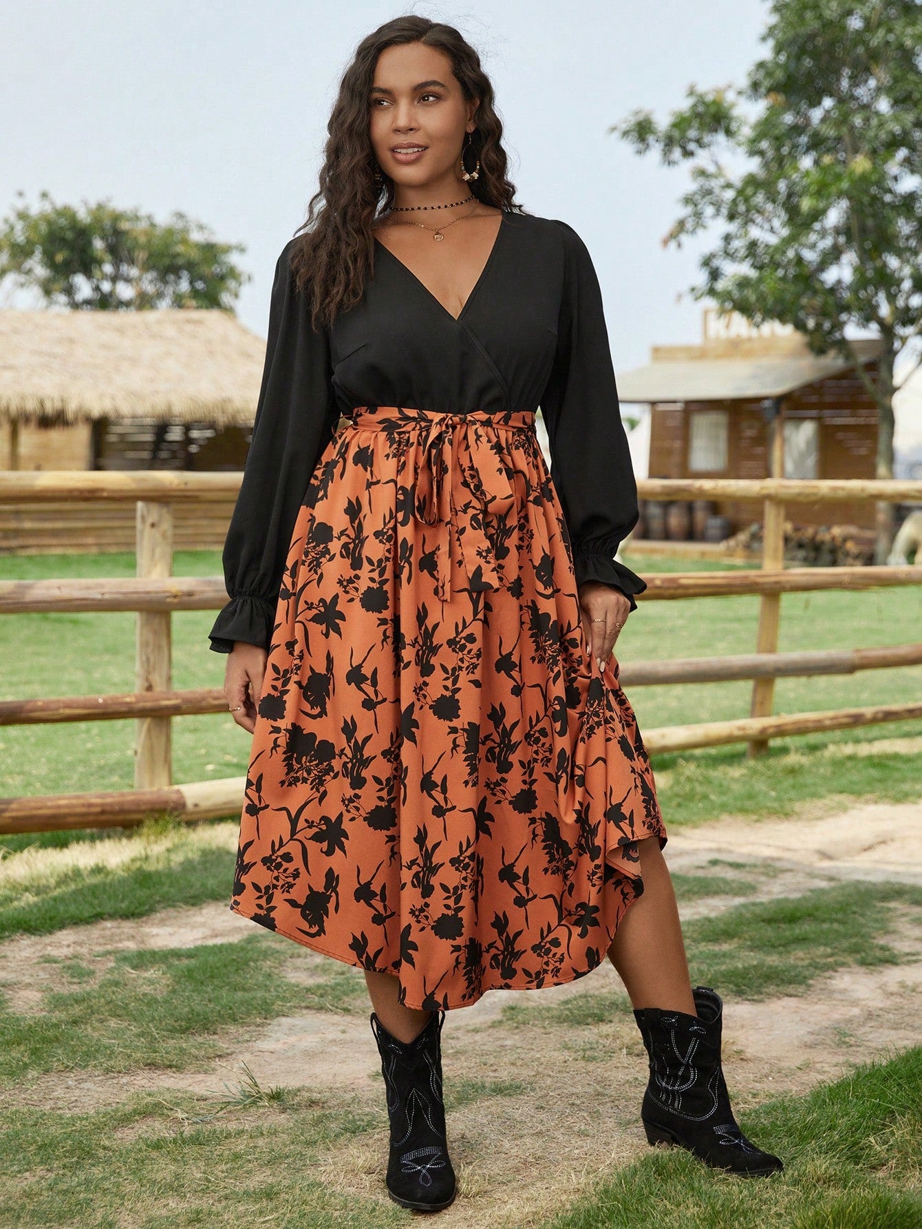 Effortlessly elegant, the Chic Plus Floral Print Dress features a playful mix of floral prints and flare sleeves. The belted waist adds a touch of sophistication to this quirky and fun dress.
