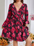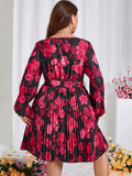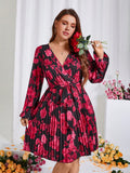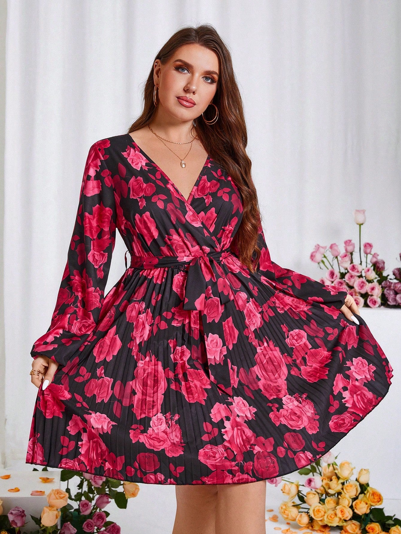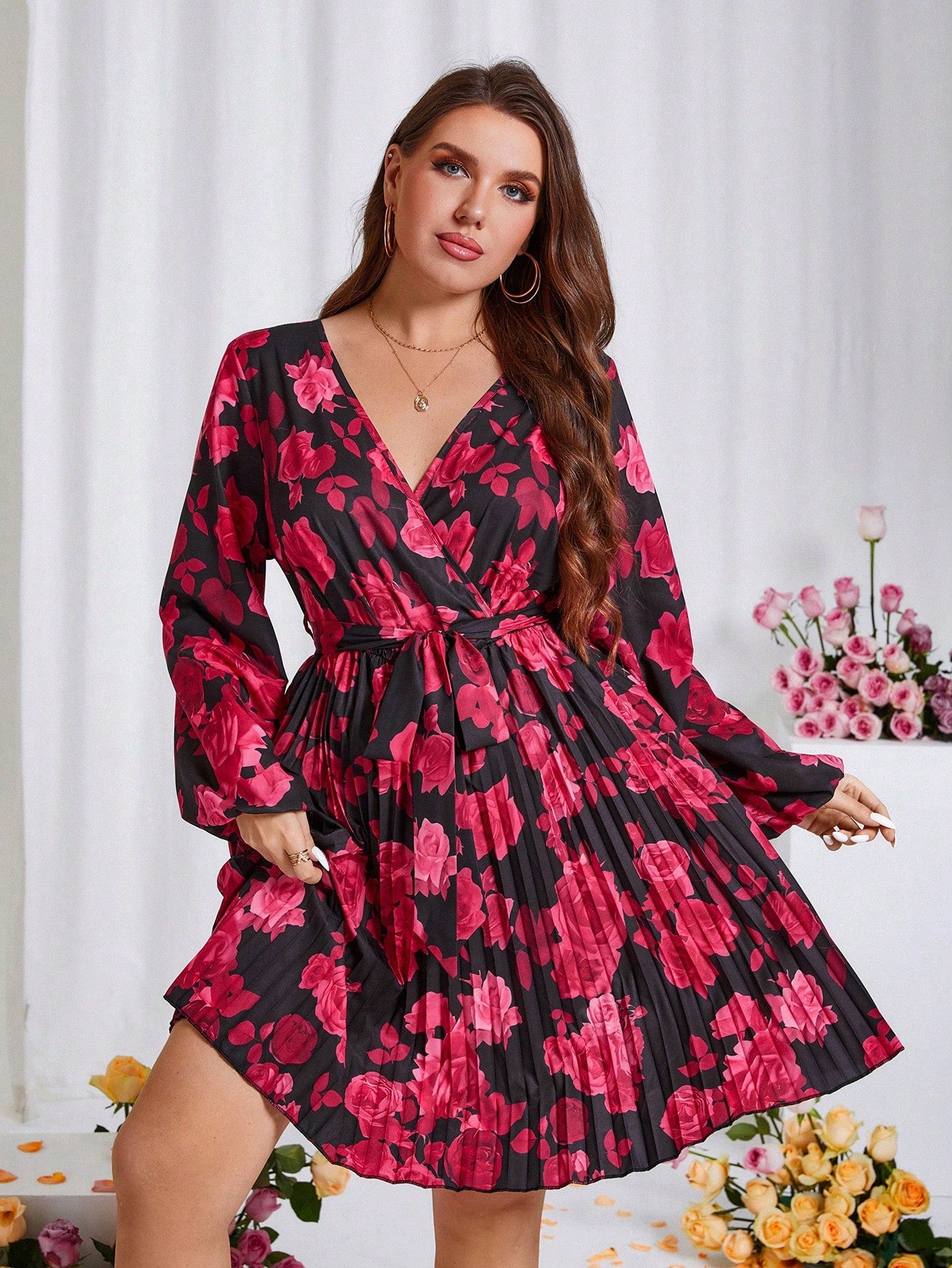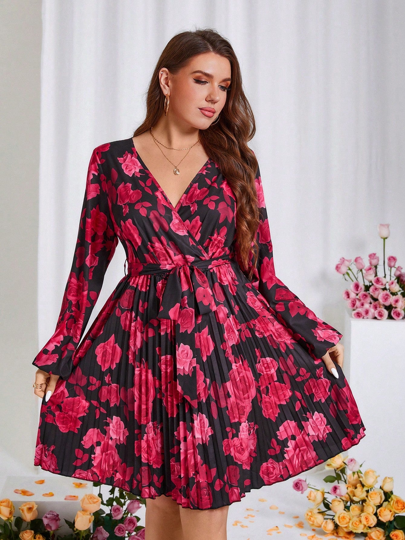 Chic Plus Size Floral Pleated Dress with Belt - Perfect for Spring & Valentine's Day