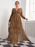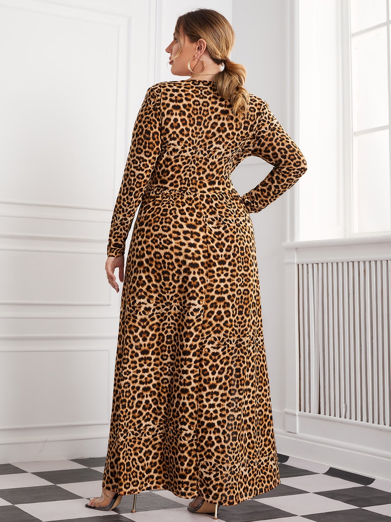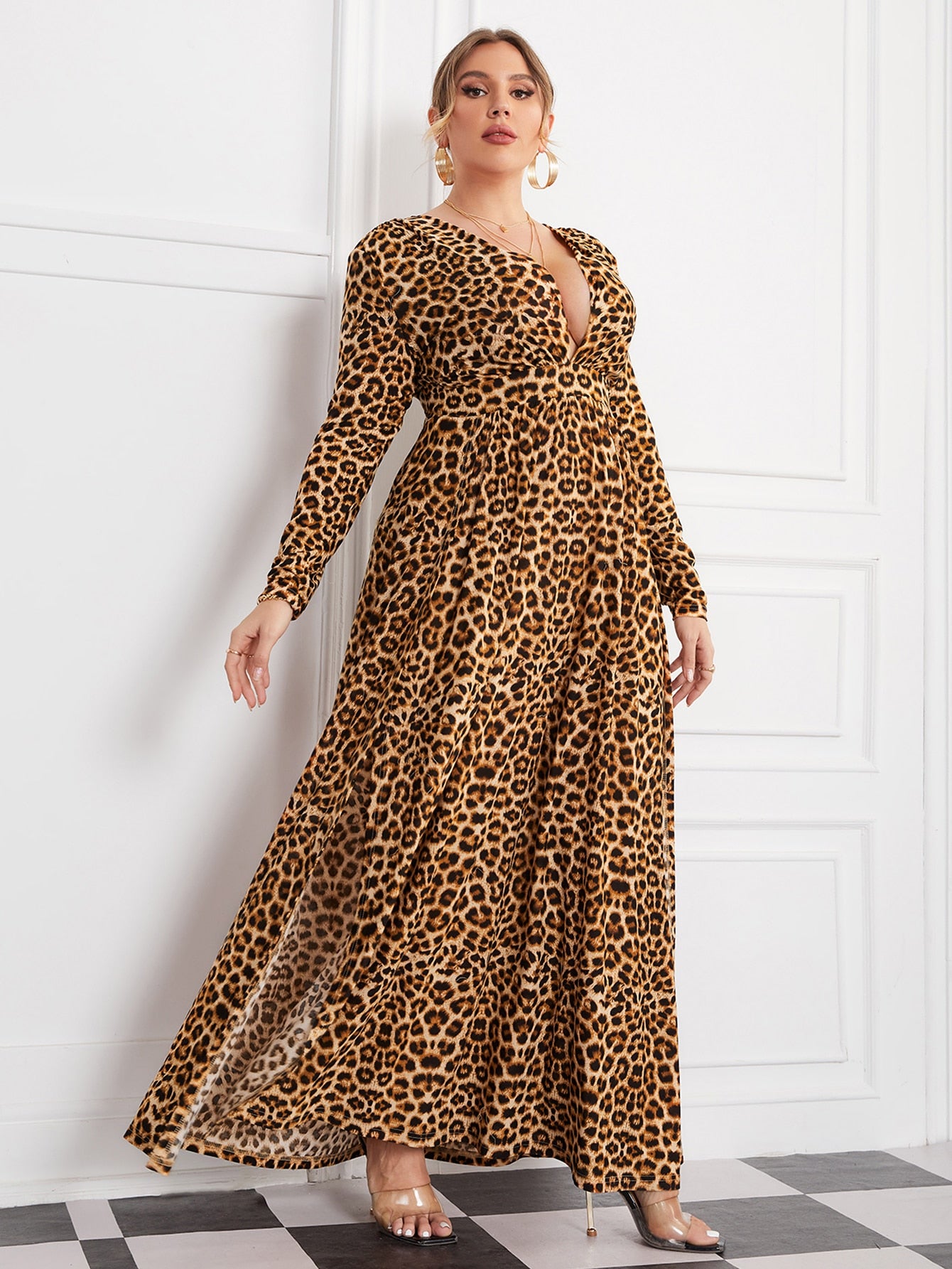Chic Plus-Size Leopard Print Plunging Neck and Split Thigh Dress