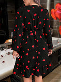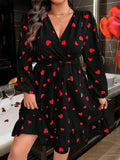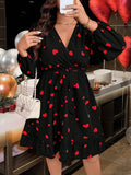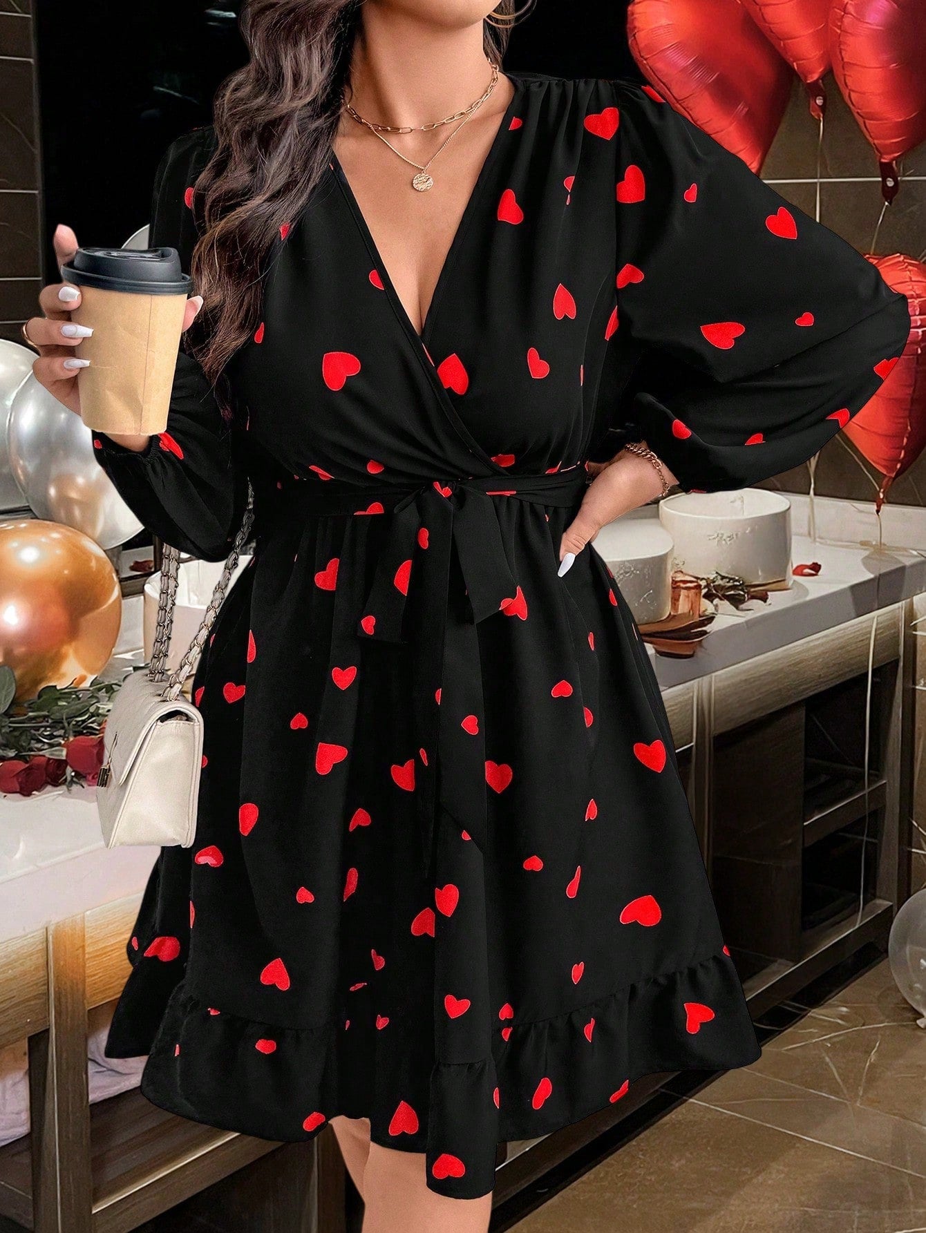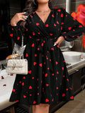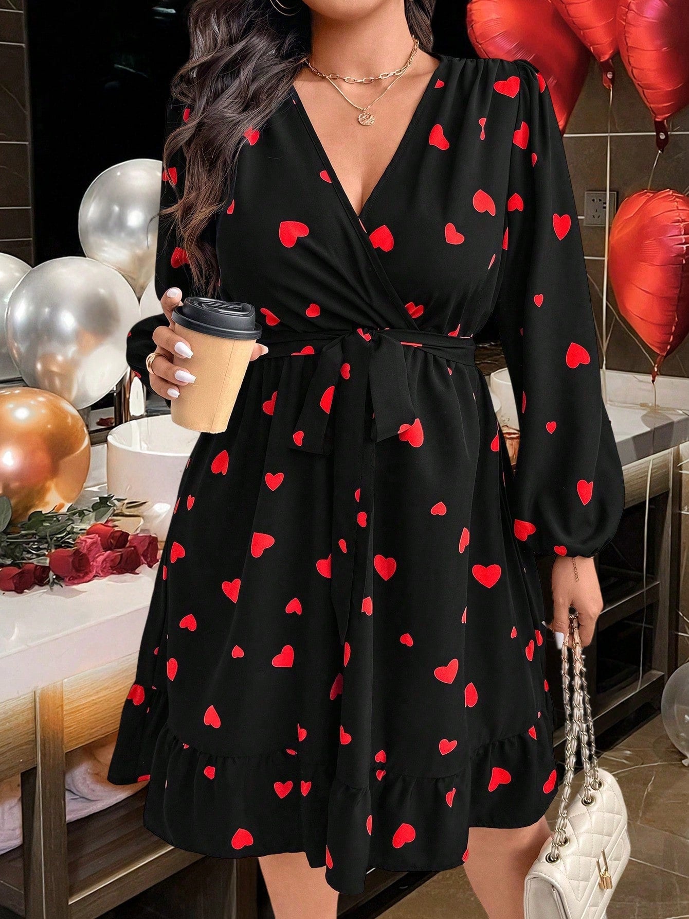 Chic Plus Size Women's Cross V-Neck Heart Print Belted Dress
