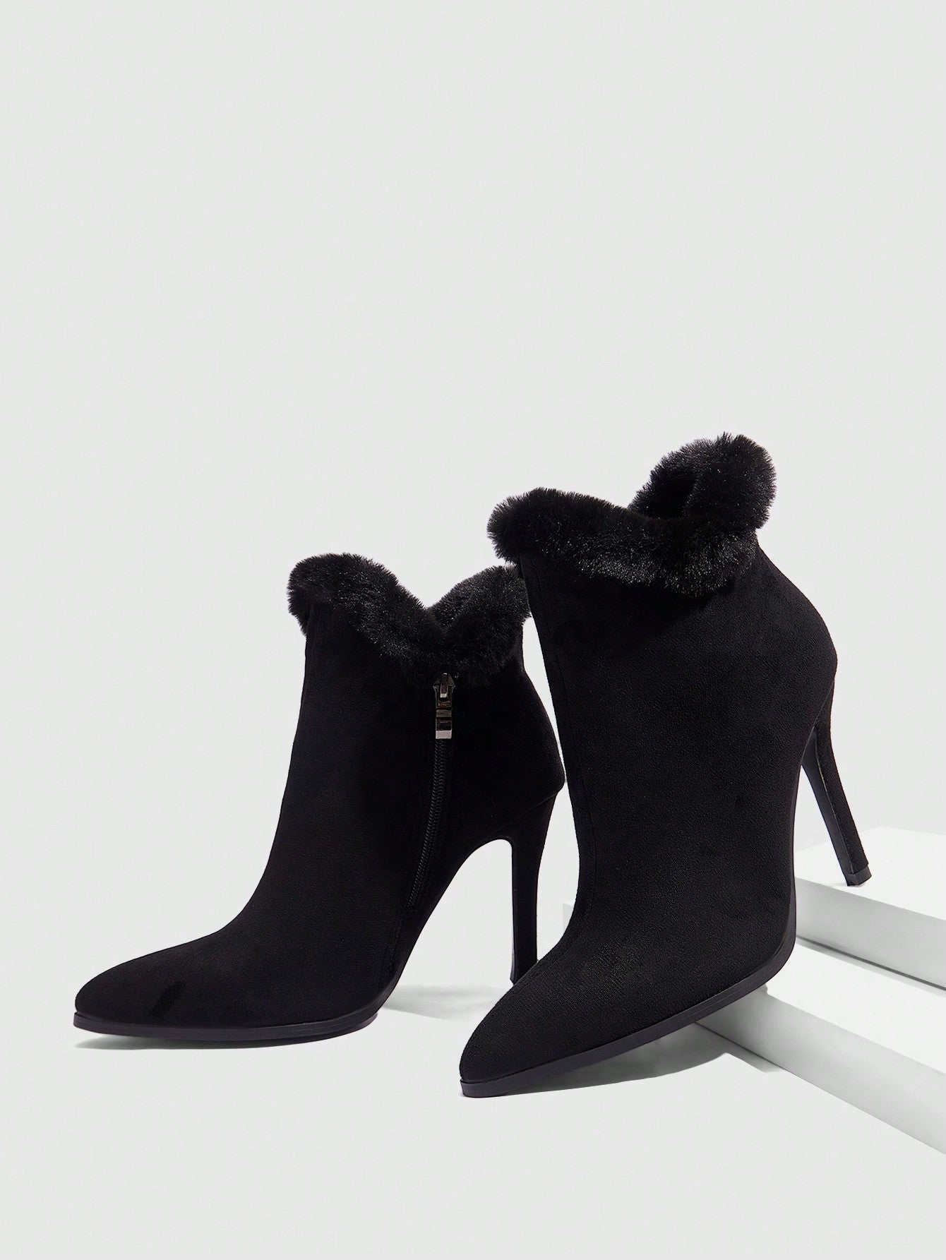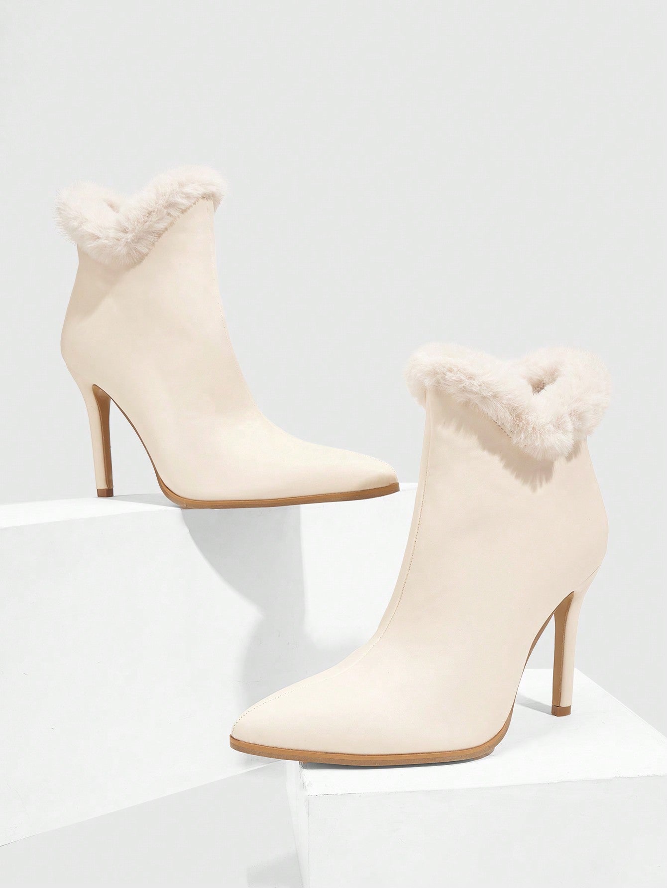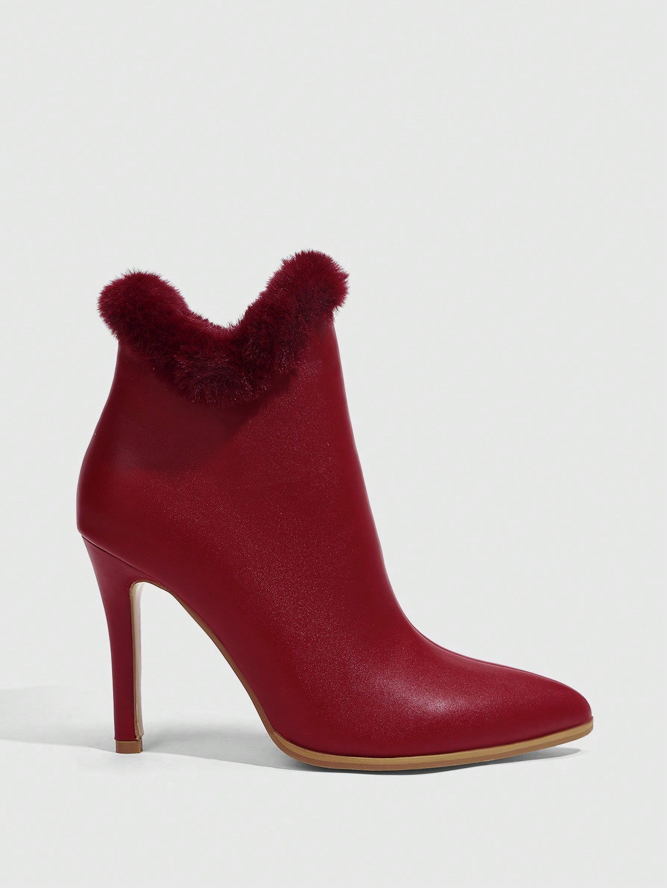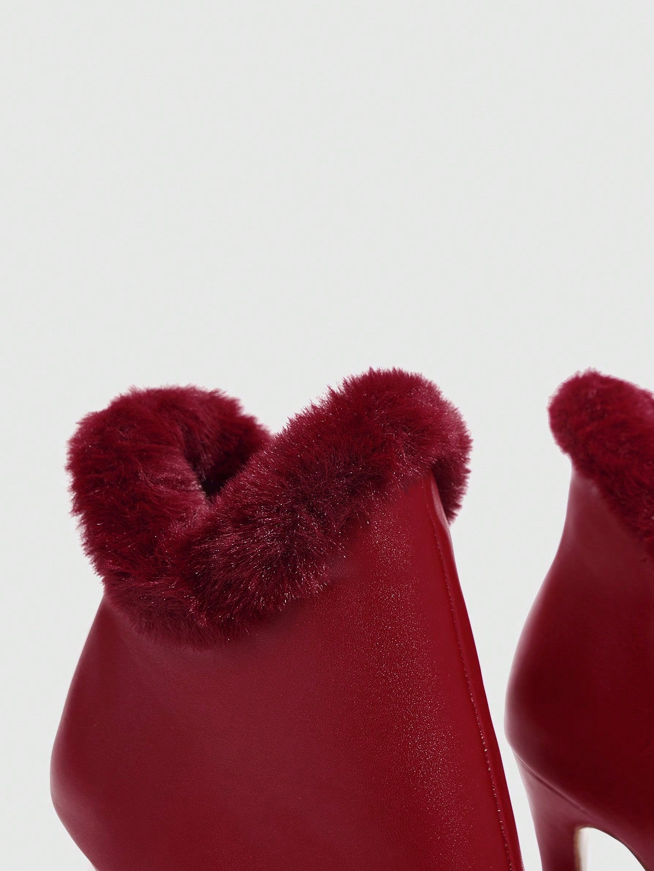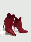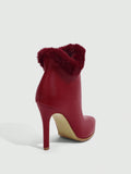Chic Red High Heel Ankle Boots with Faux Fur Accents