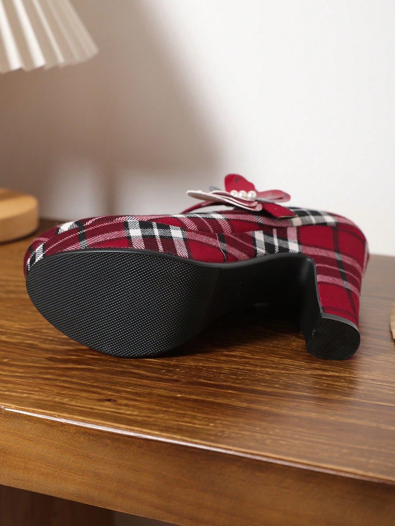 Add height and style to your autumn wardrobe with these chic red plaid Mary Jane heels. The chunky block design provides comfort and stability, making them perfect for all-day wear. Elevate any outfit with these trendy and versatile shoes. (No instructions were used in this description)