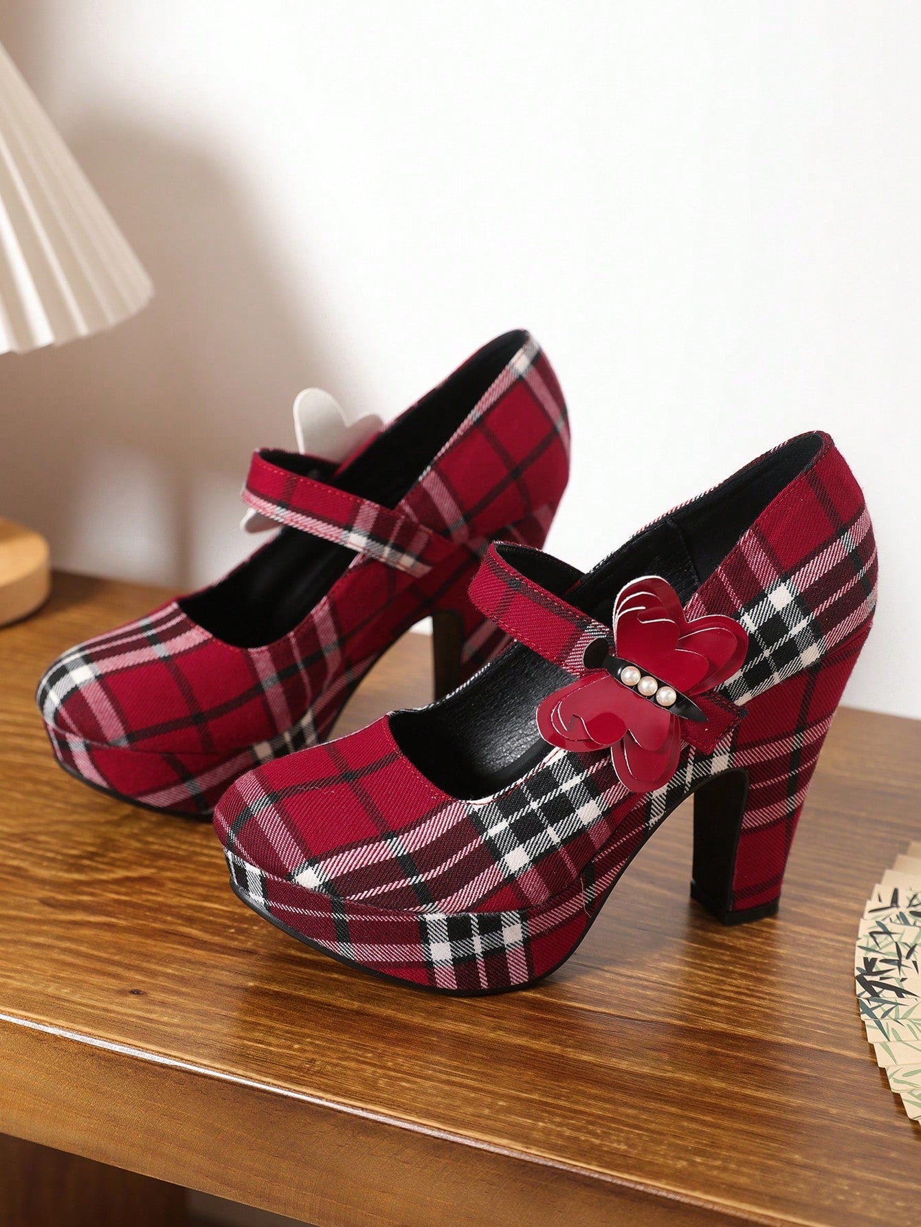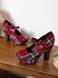 Chic Red Plaid Mary Jane Heels with Chunky Block Design – Perfect for Adding Height and Style This Autumn!