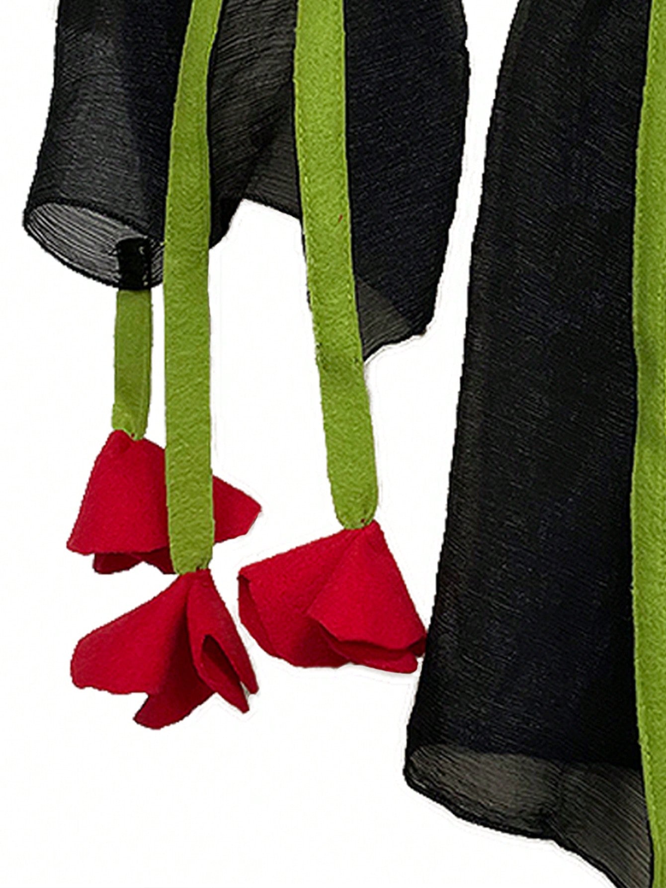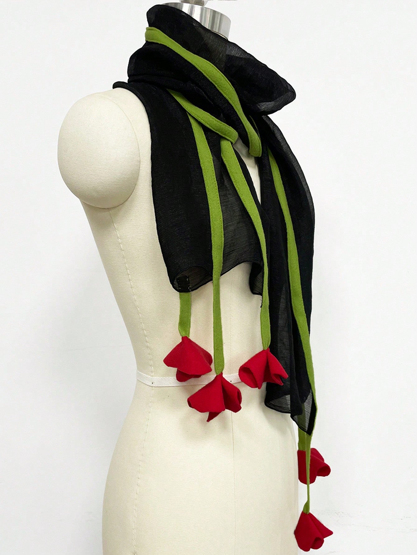This black gauze scarf with simulated red blooms offers effortless style with a chic retro touch. Made from high-quality materials, this scarf adds a pop of color to any outfit while providing lightweight comfort. Perfect for any fashion-forward individual looking to elevate their wardrobe.