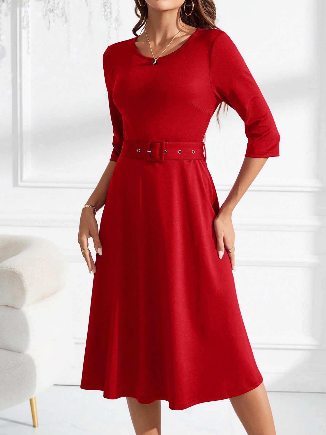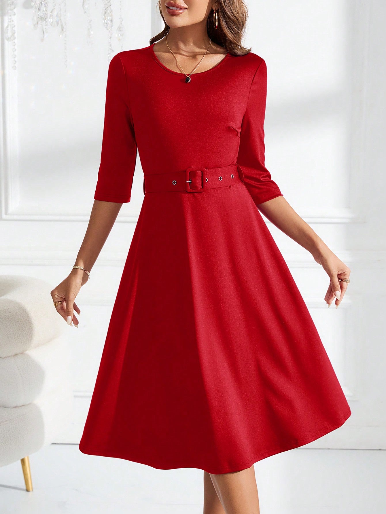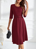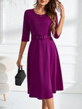 Chic Solid Color Half-Sleeve Casual Dress with Waist Tie for Effortless Style