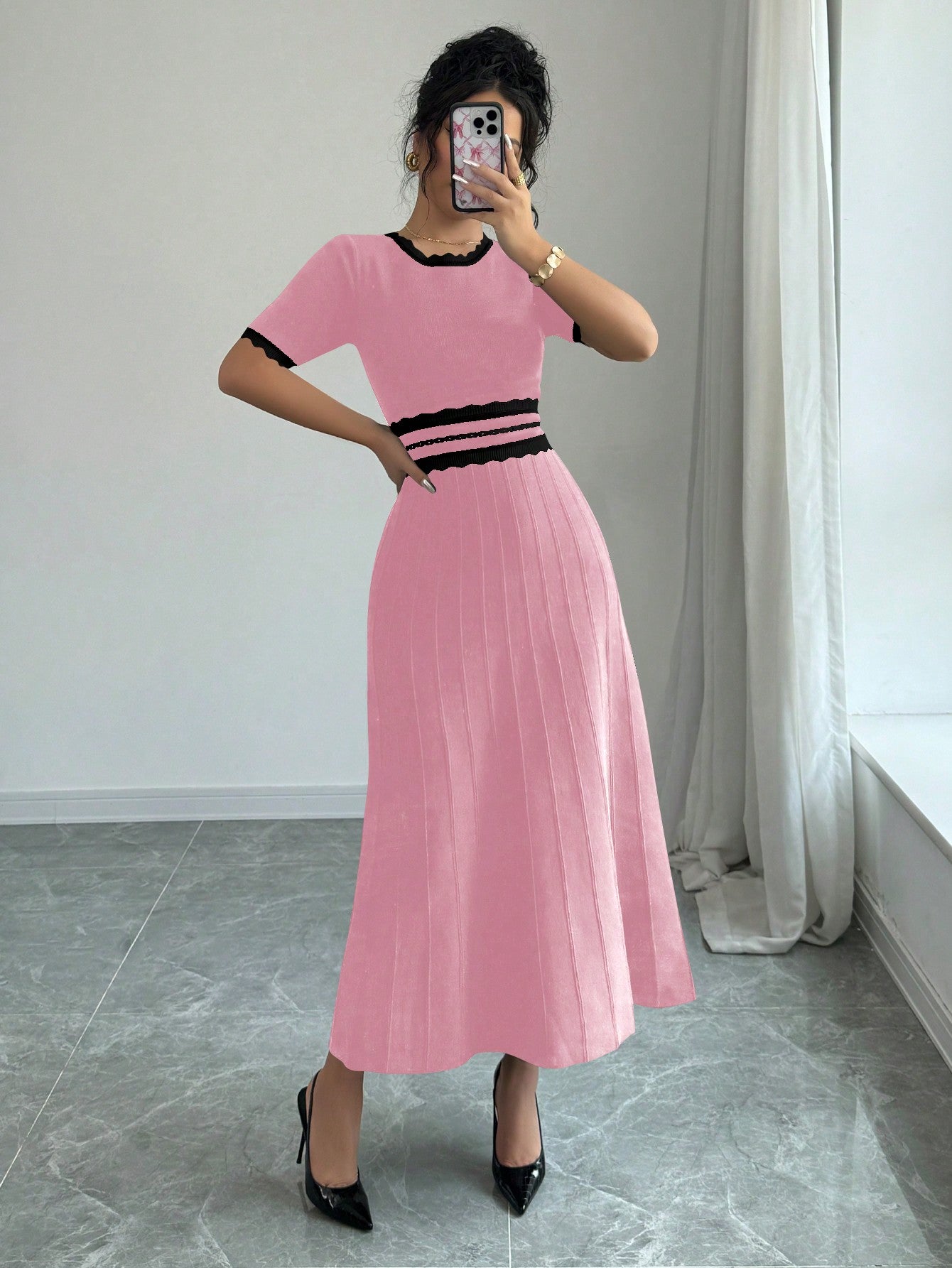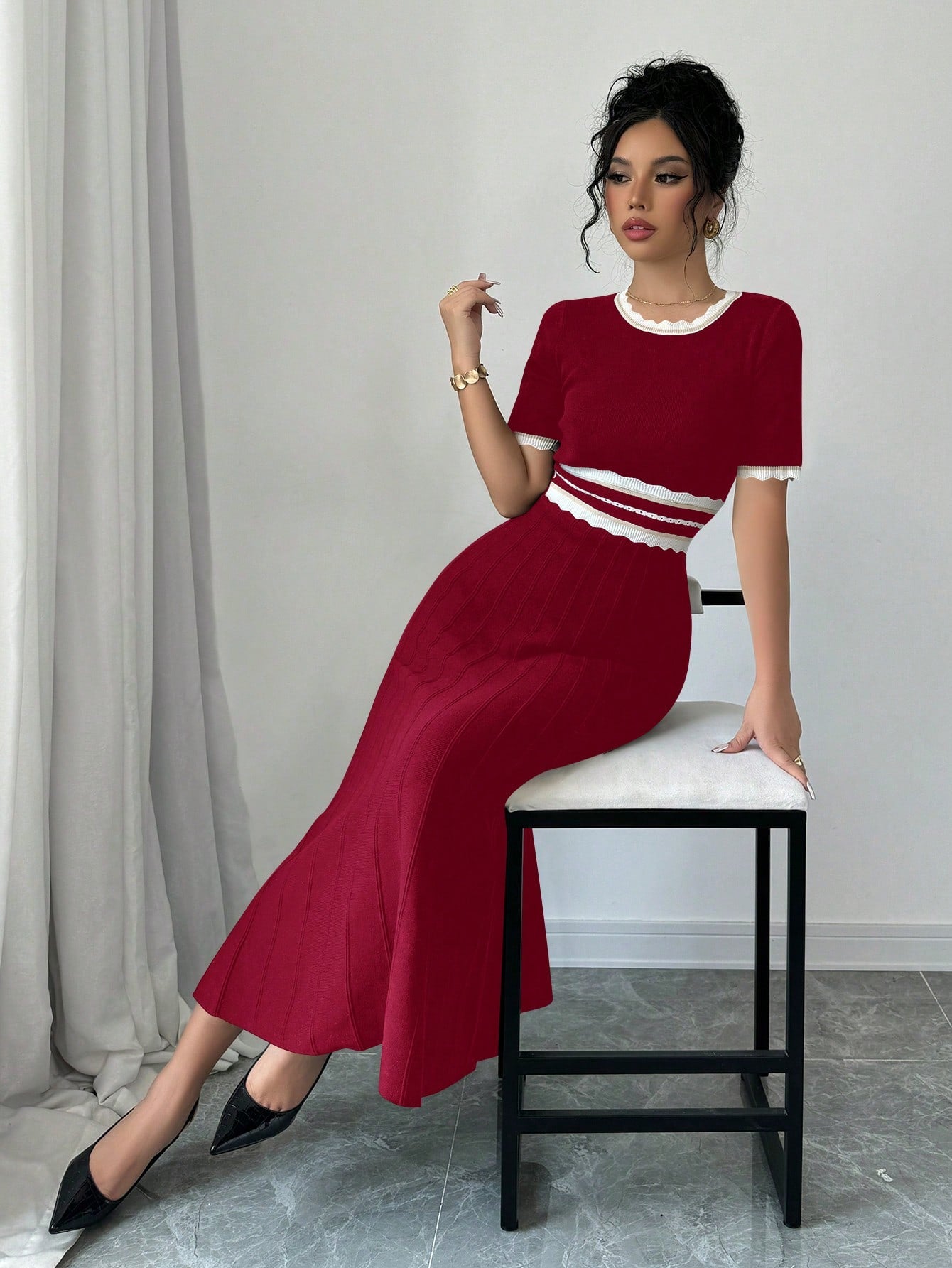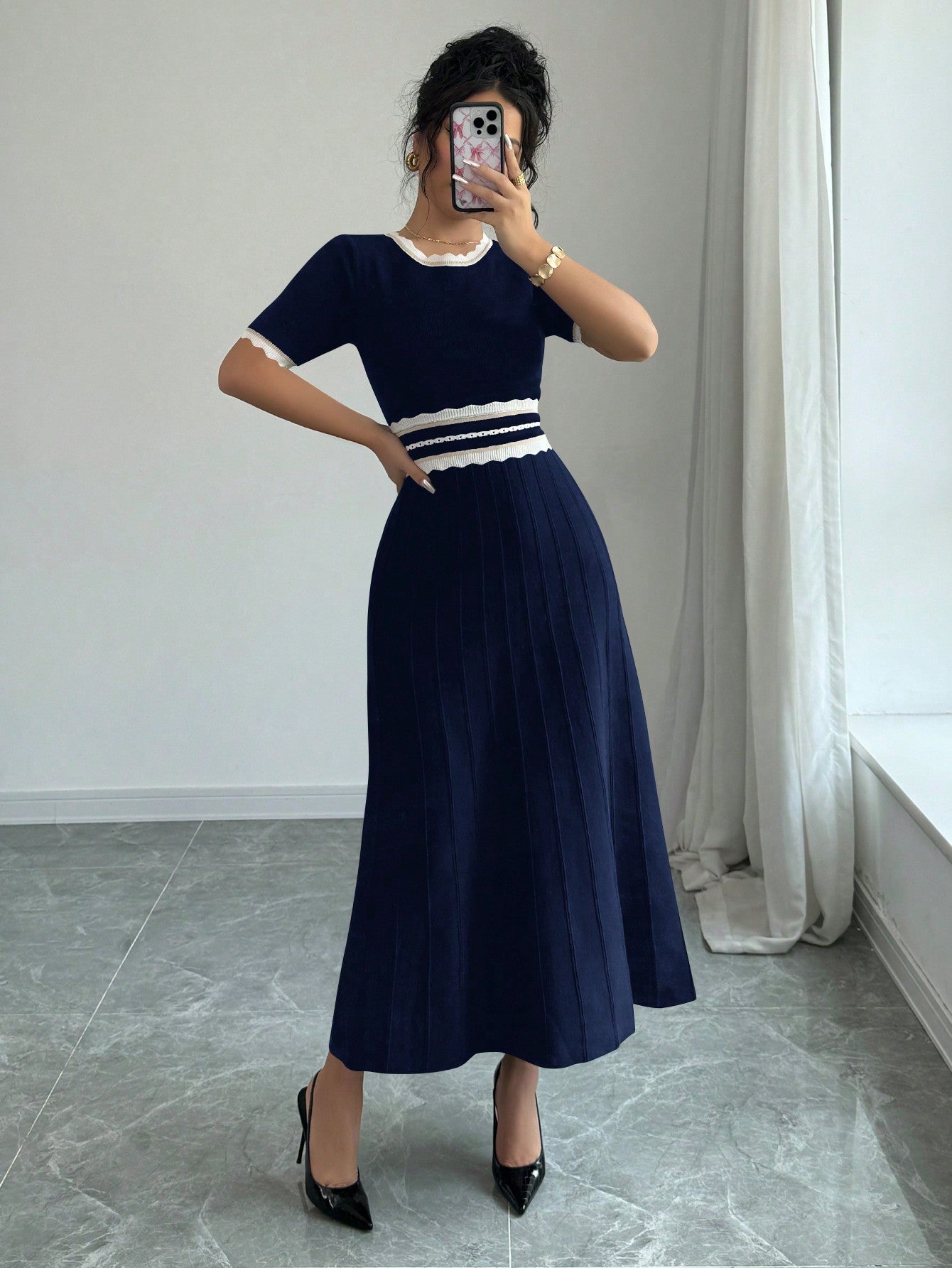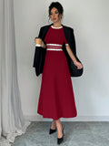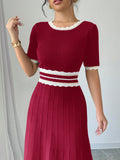 Chic Striped Round Neck Pleated Hem Knitted Dress for Elegant Autumn Style