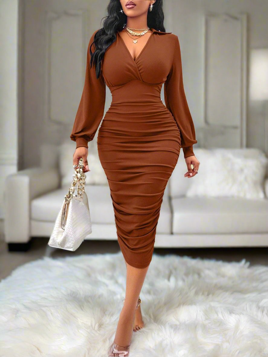 Step into effortless elegance with our Chic V-Neck Ruched Bodycon Dress. Featuring a flattering V-neck neckline and ruched detailing, this dress hugs your curves in all the right places. Perfect for any occasion, its versatile style will make you feel chic and elegant, effortlessly.