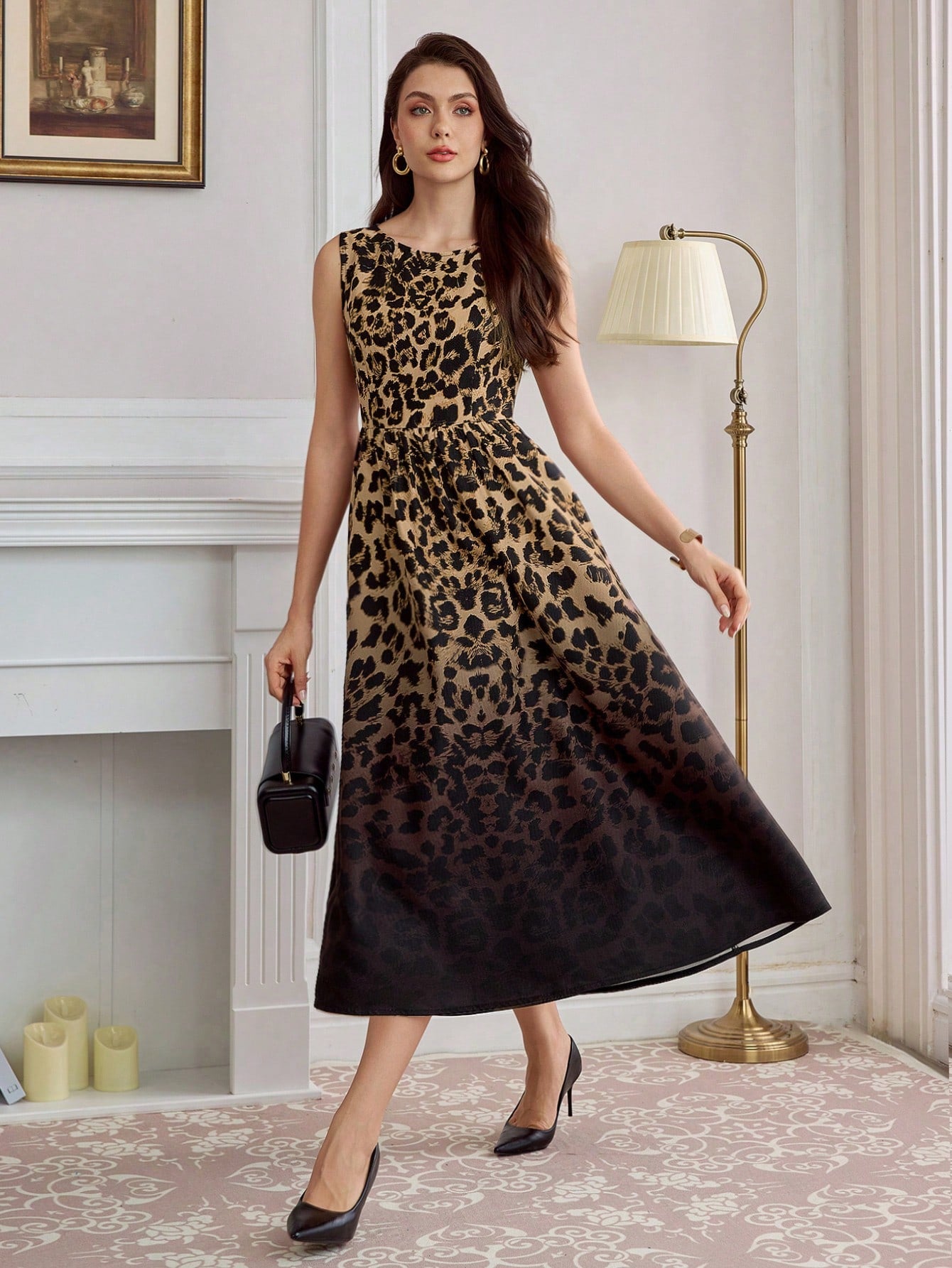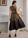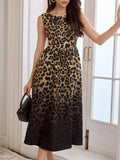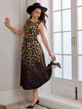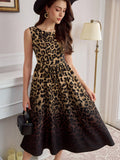 Chic Vintage-Inspired Sleeveless A-Line Midi Dress with Leopard Print & Pockets