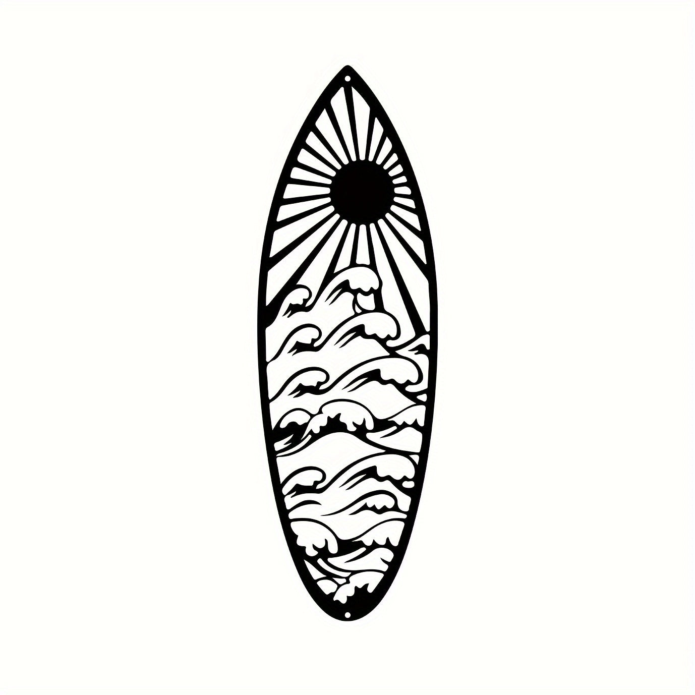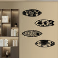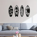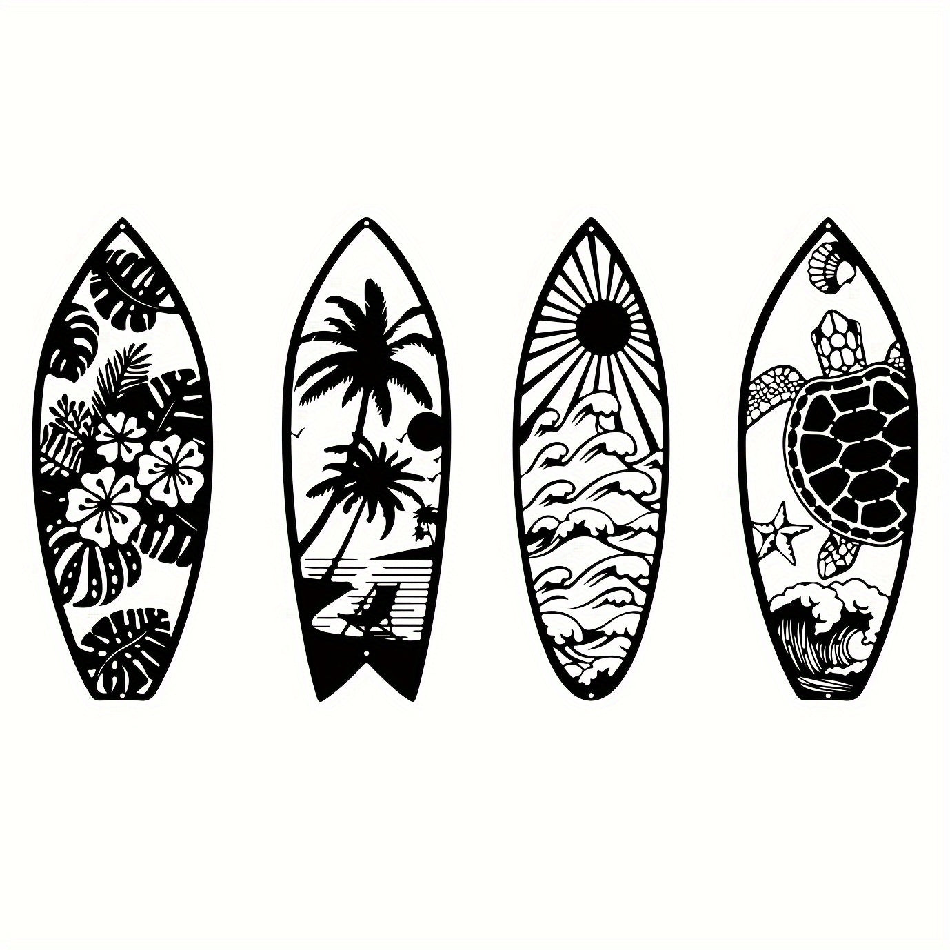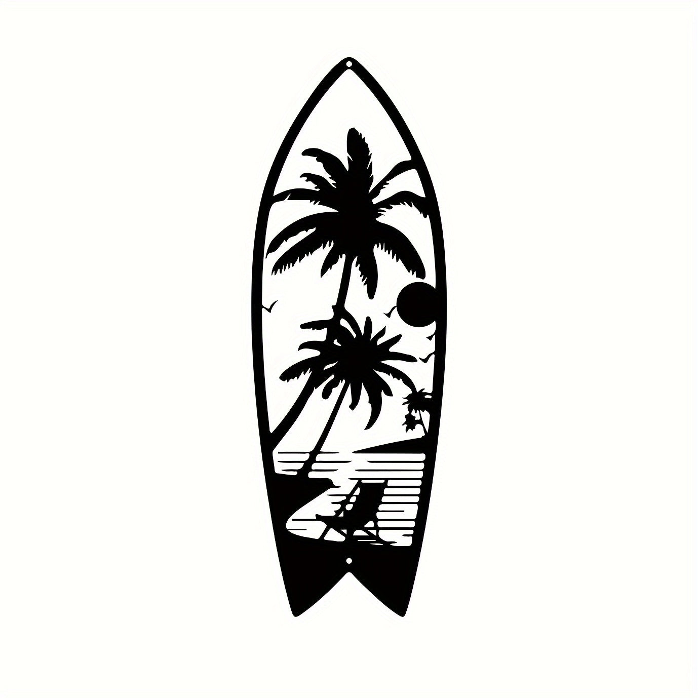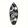 Elevate your space with Coastal Vibes: Metal Surfboard Wall Decor. Made of high-quality metal, this summer-inspired wall art features a turtle, palm tree, and surfboard design. Perfect for both indoor and outdoor use, add a touch of coastal charm to your home with this 15.8" black piece.