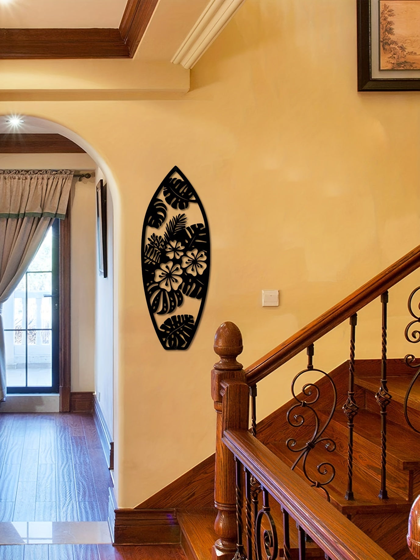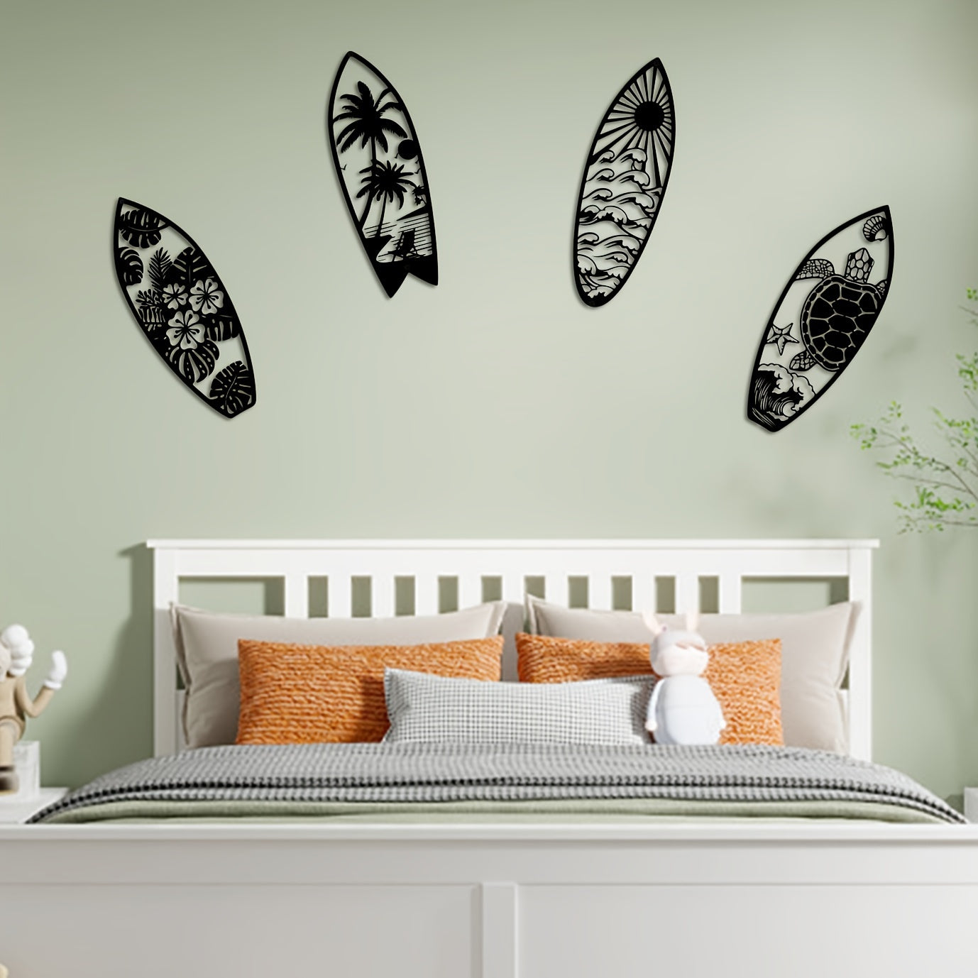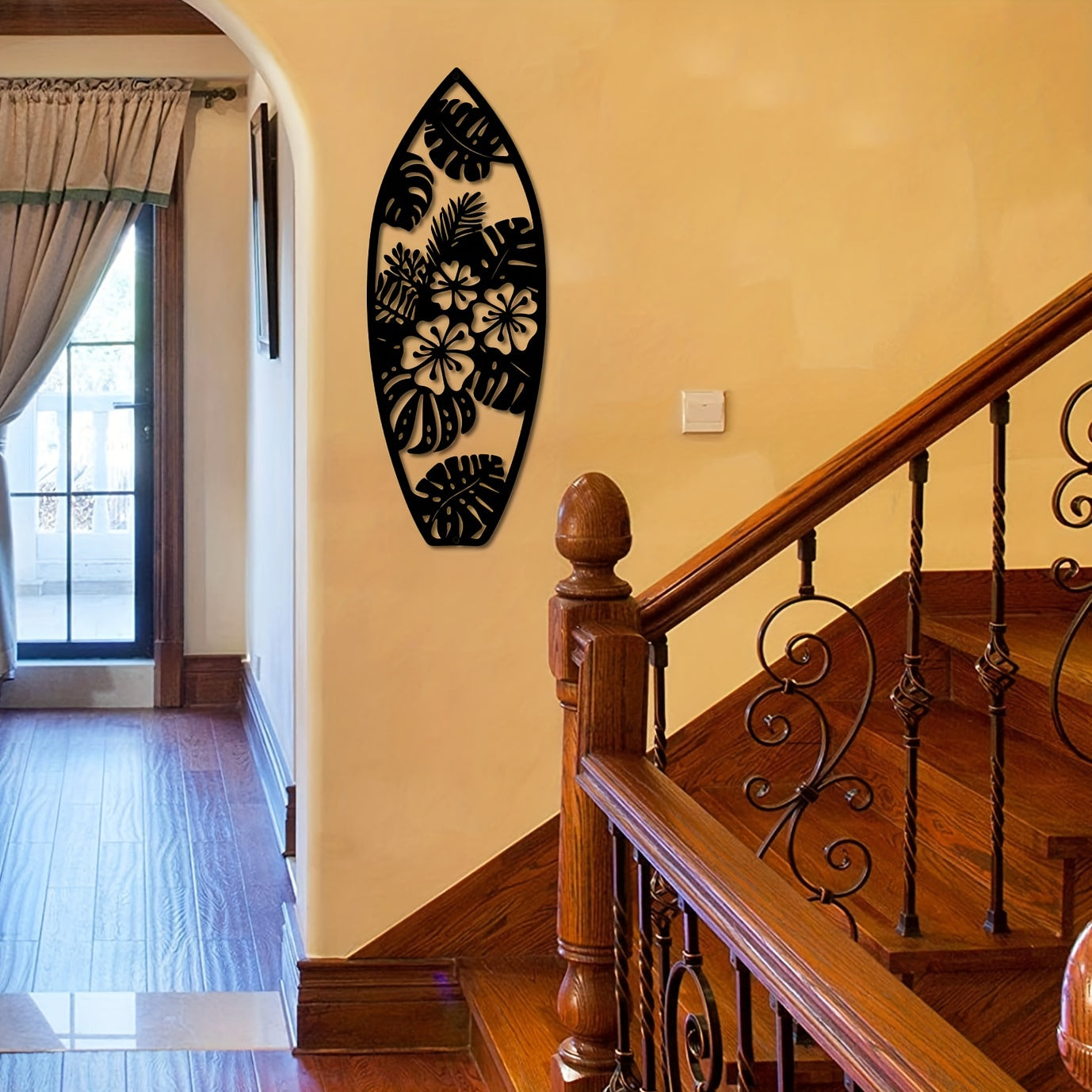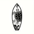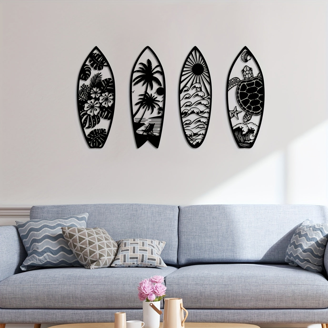 Elevate your space with Coastal Vibes: Metal Surfboard Wall Decor. Made of high-quality metal, this summer-inspired wall art features a turtle, palm tree, and surfboard design. Perfect for both indoor and outdoor use, add a touch of coastal charm to your home with this 15.8" black piece.