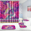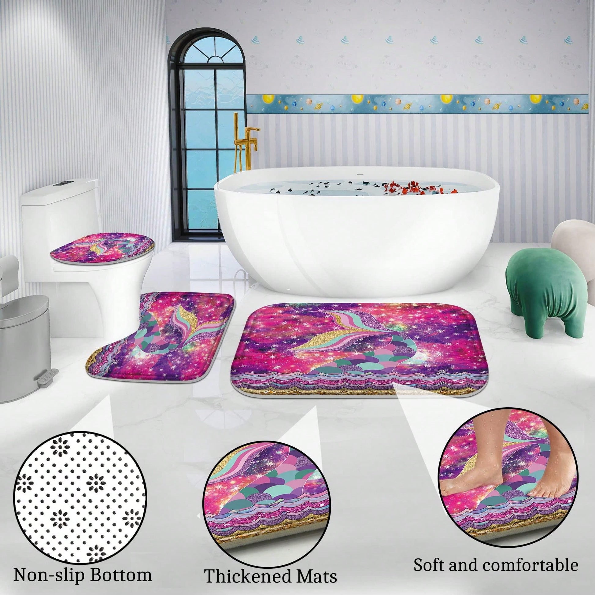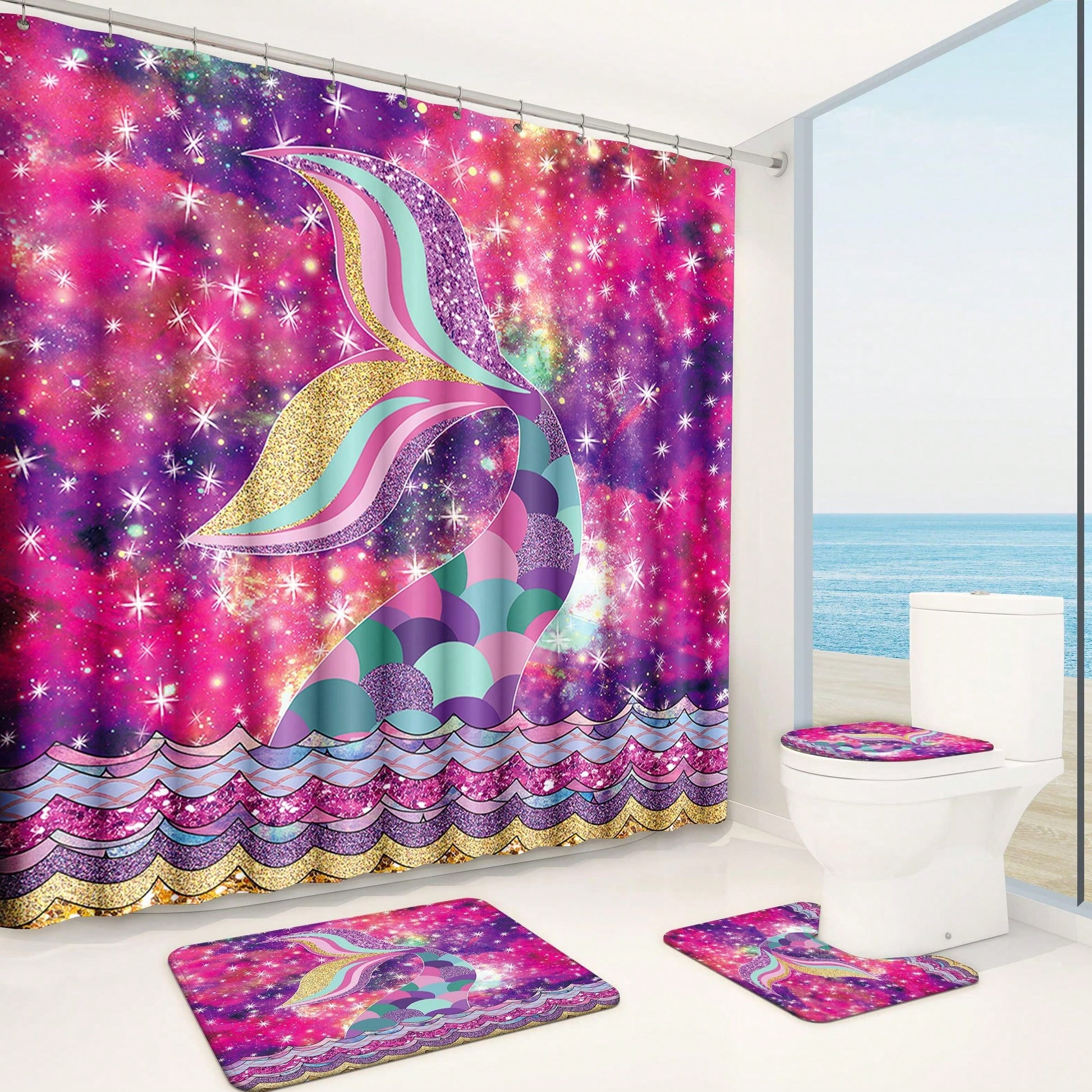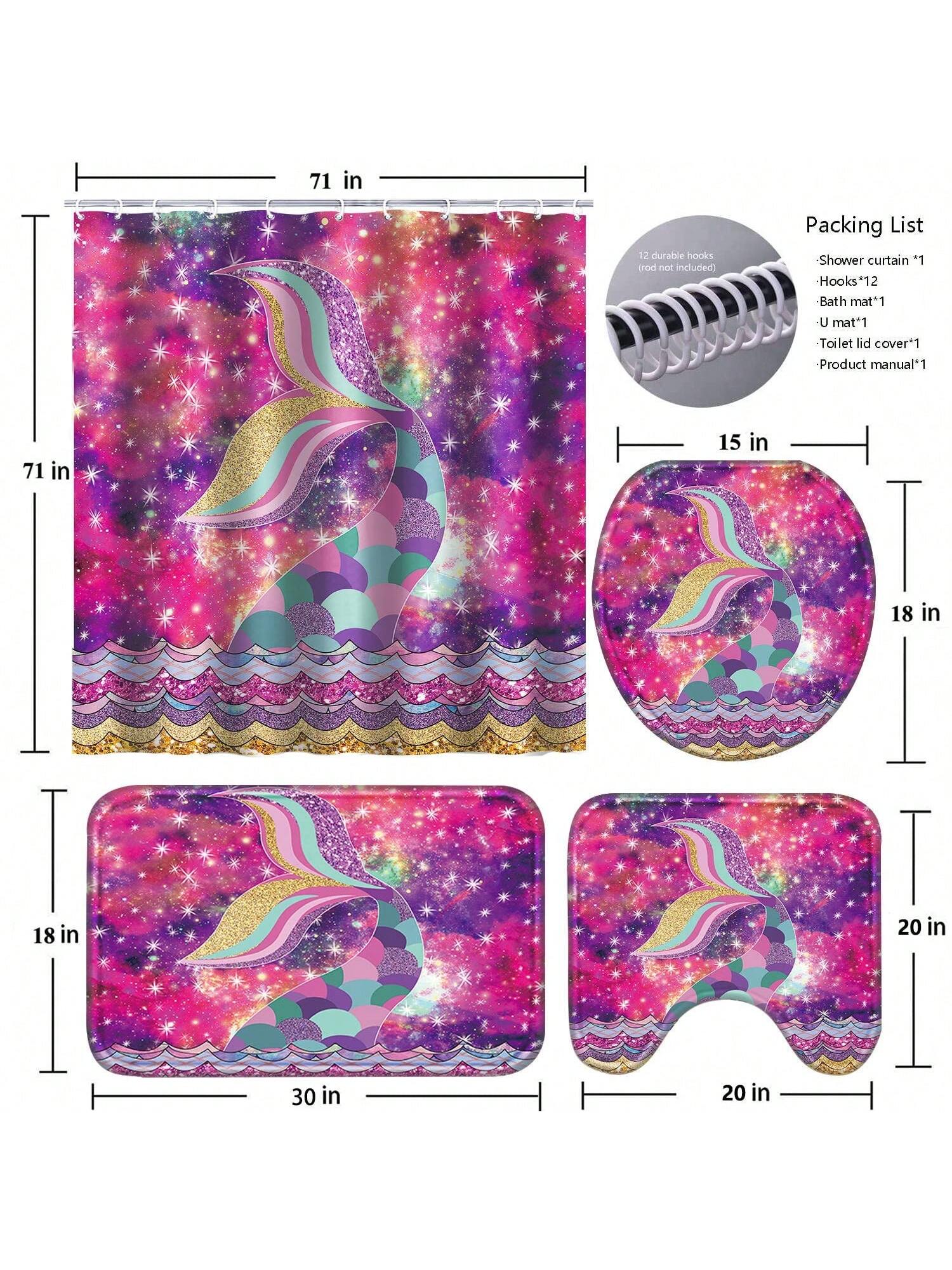 shower curtain, rugs, and more, all featuring a colorful fish scale tail design. With this set, you'll be able to effortlessly create a fun and unique bathroom aesthetic."
