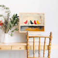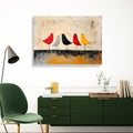 Colorful Modern Bird Art Featuring Minimalist Red, Yellow, Black, And White Birds Standing Together On A Textured Abstract Background
